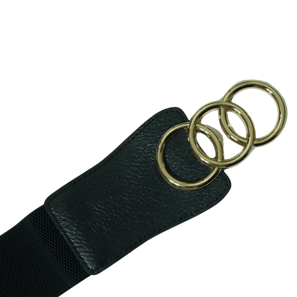 Wide Black Elastic Cinch Belt with Gold Interlocking Buckle Elevate your wardrobe with this versatile black stretch waist belt, designed for both comfort and style. Featuring a premium gold interlocking rings buckle, this cinch belt adds a sophisticated accent to dresses, tunics, and oversized tops. The elastic construction provides a flexible fit that adapts to your body, ensuring all-day comfort without restriction. Perfect for creating defined silhouettes or layering over outerwear, this essential accessory transitions seamlessly from casual to formal occasions. The durable elastic material maintains its shape through repeated wear, while the striking gold hardware elevates any ensemble with understated elegance.