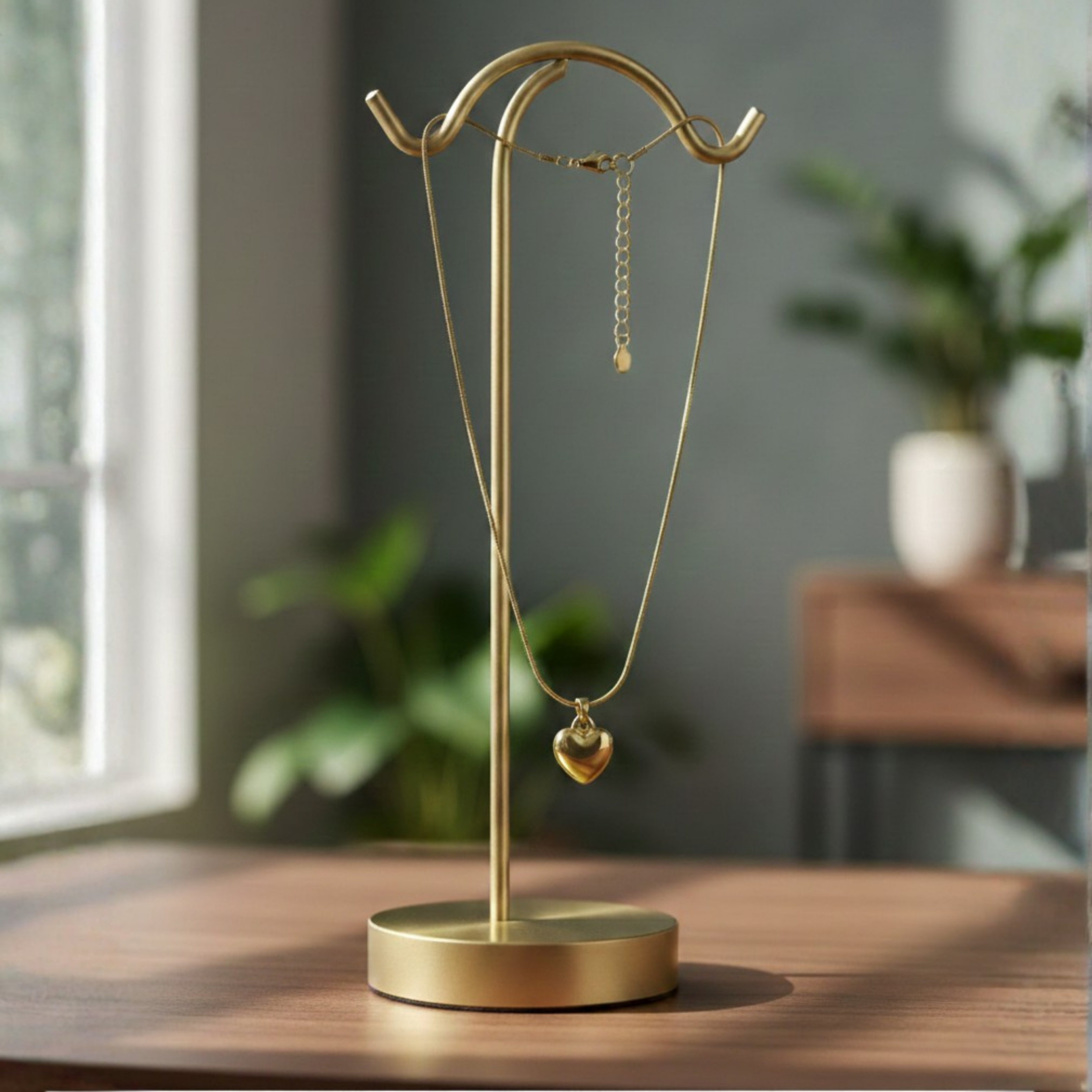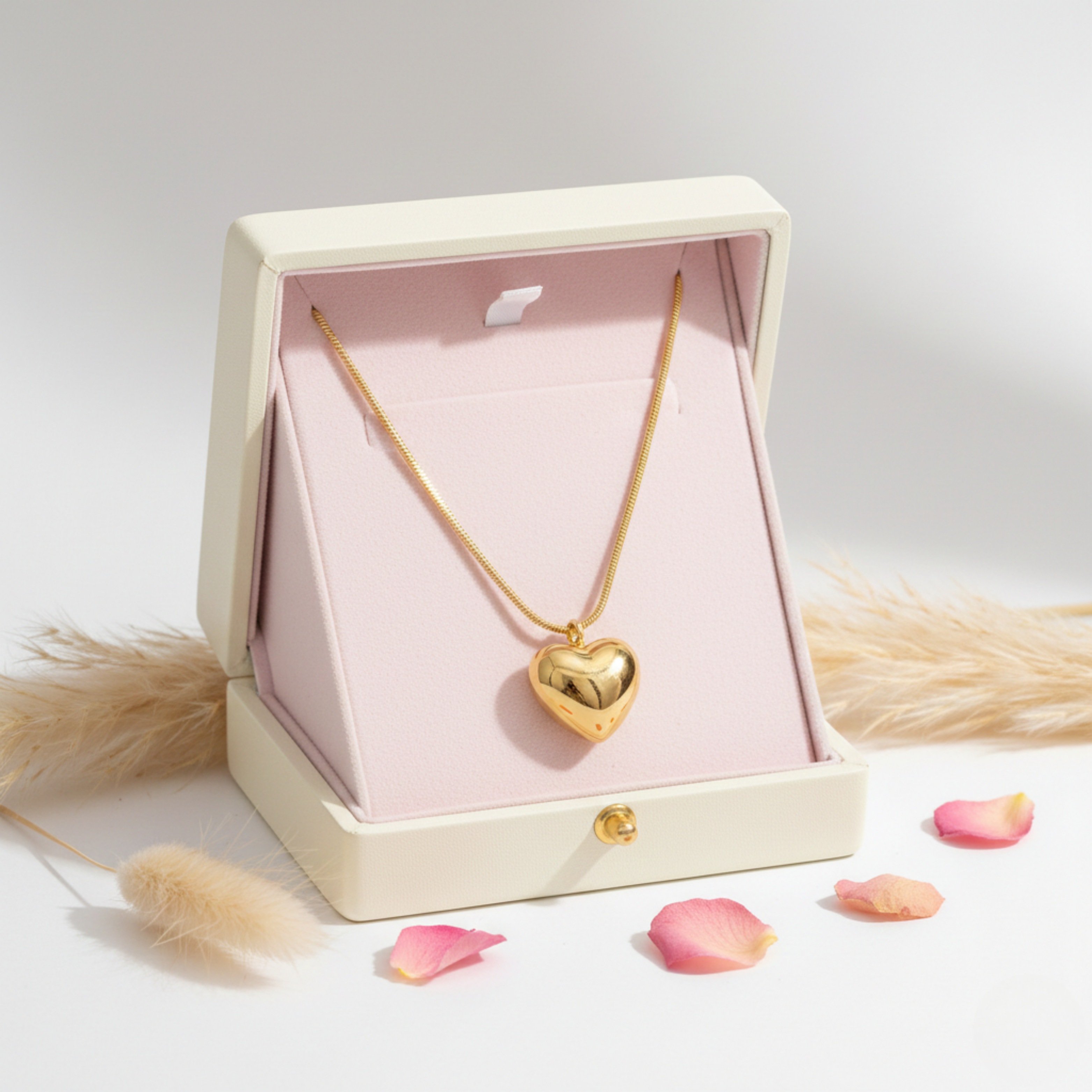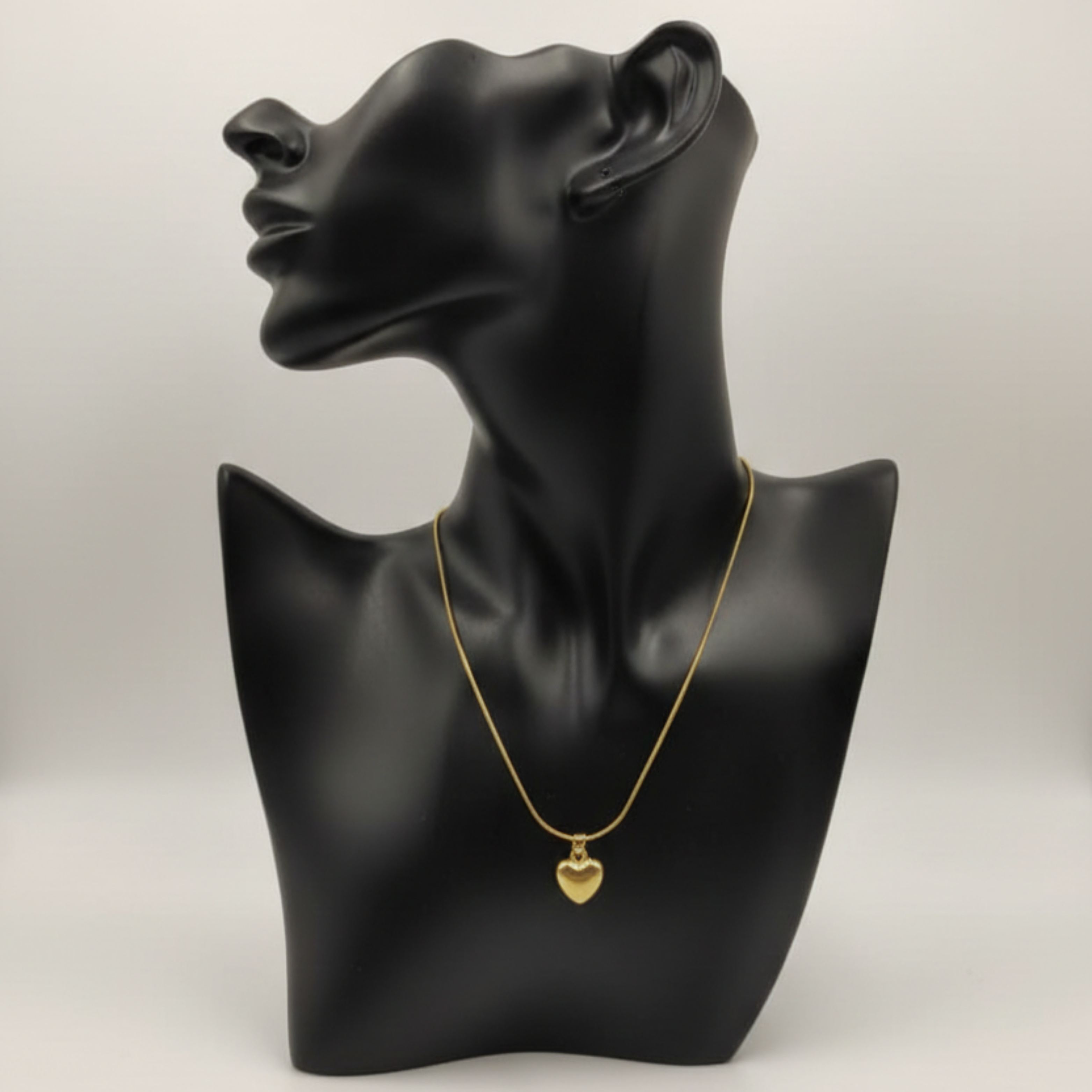 This necklace features a delicate gold-tone chain paired with a smooth, high-polish heart-shaped pendant. The rounded heart design reflects light beautifully, creating a subtle glow that enhances its minimal charm. Lightweight and perfectly balanced, it rests gently at the neckline for a refined and feminine look.