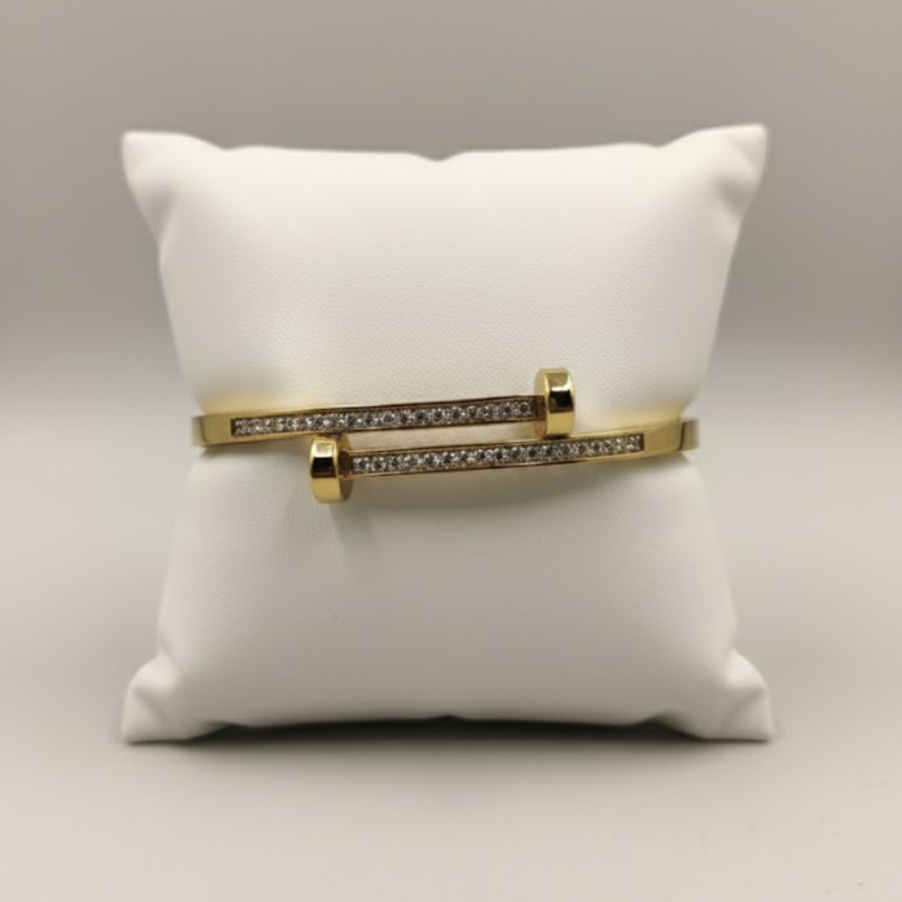 This contemporary open bangle features a slim gold-tone band accented with two parallel crystal-studded bars at the front. The clean linear design is enhanced with precisely set crystals that catch the light subtly, adding sophistication without excess shine. The open-front structure ensures a comfortable fit while maintaining a polished, structured look.