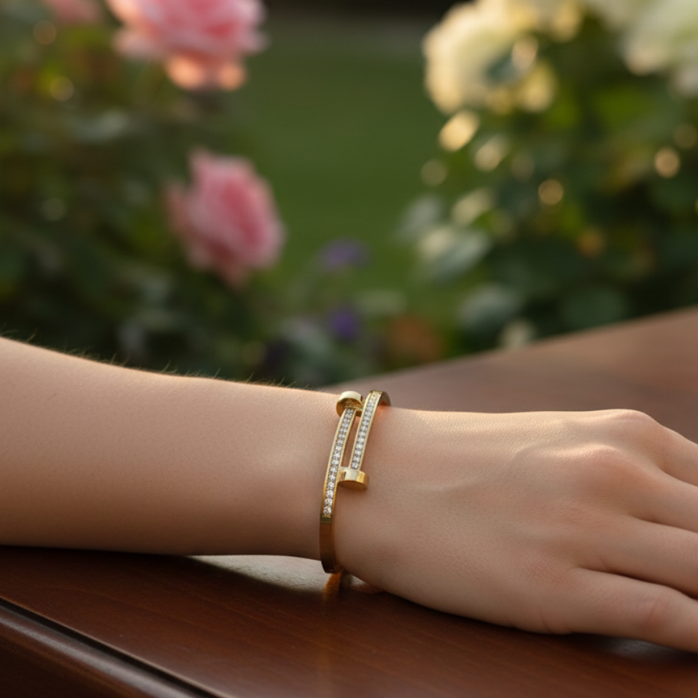 Sleek, radiant, and thoughtfully designed — the Crystal Bar Open Bangle Bracelet in Gold Tone brings modern elegance to your everyday jewellery collection. Its refined silhouette and delicate sparkle make it a timeless piece for effortless styling.