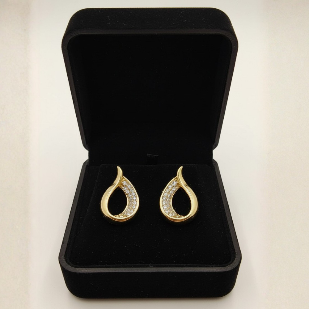 These elegant stud earrings feature a teardrop-shaped open design, beautifully sculpted with smooth flowing curves that frame the face. The inner curve is adorned with closely set sparkling crystals, creating a delicate contrast against the polished gold-tone outline. The high-shine finish enhances the brilliance of the crystals, while the compact stud style ensures comfort and secure wear throughout the day.