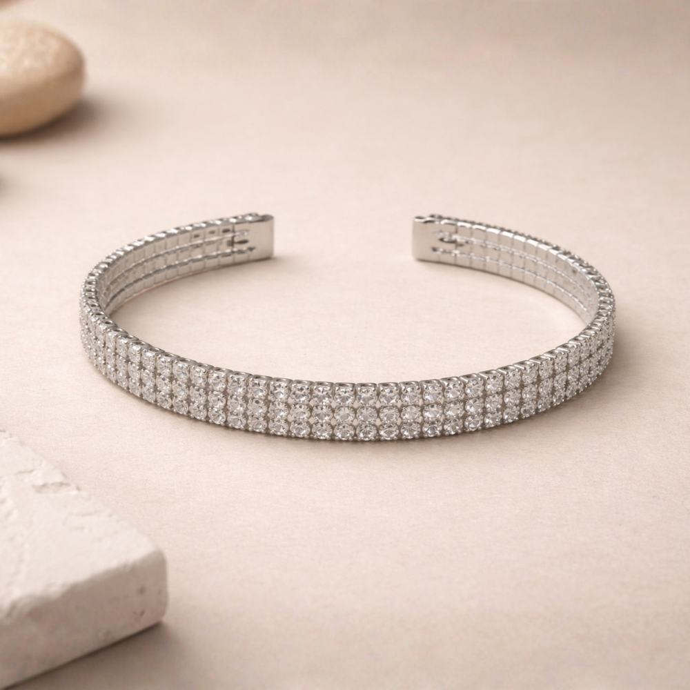 A sleek multi-row crystal tennis pattern that delivers a rich, diamond-like shine. Each stone is neatly set in a structured grid design, creating a luxurious look with maximum brilliance.