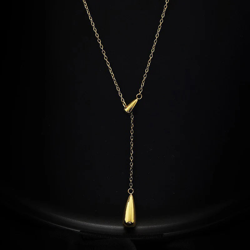 This elegant necklace features a fine, lightweight chain that forms a classic Y-shaped silhouette, drawing the eye downward for a flattering effect. At the center, a sleek connector leads to a slender dangling drop charm that moves gently with every step. Finished in a polished gold tone, the design feels modern, airy, and beautifully understated.