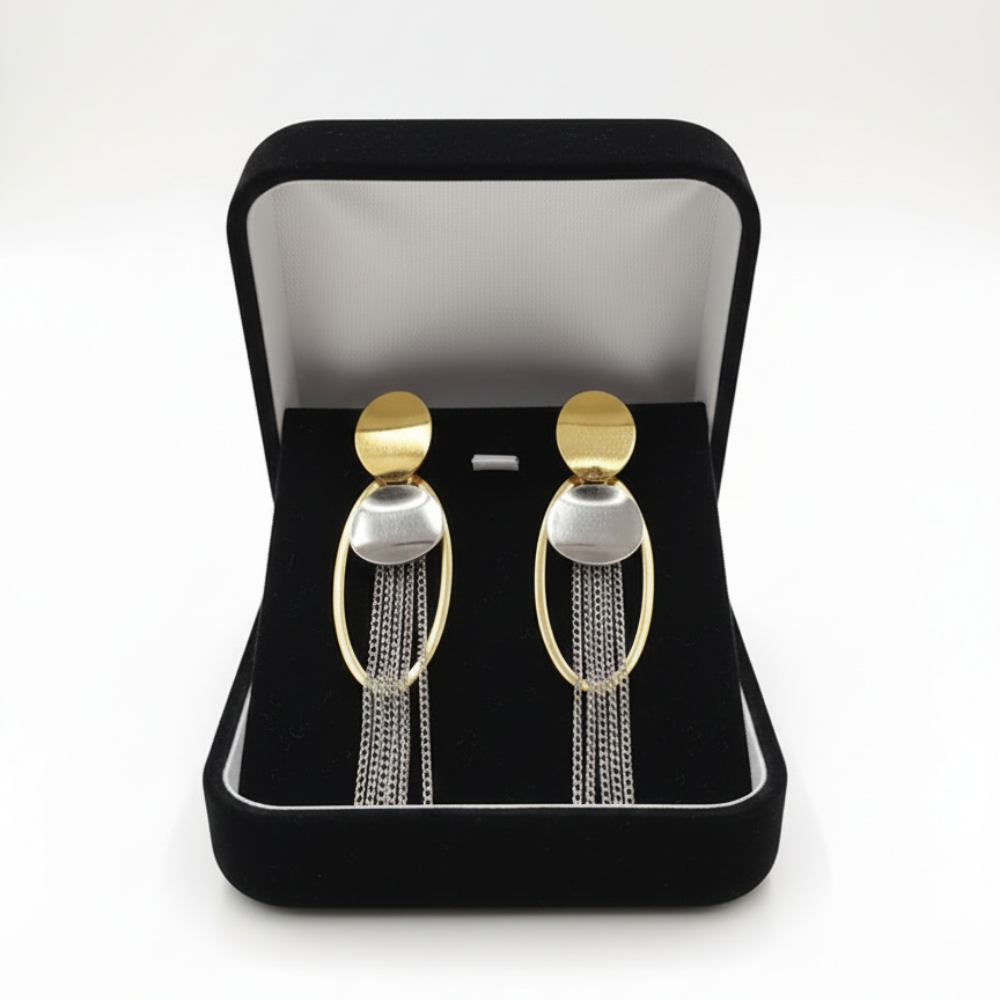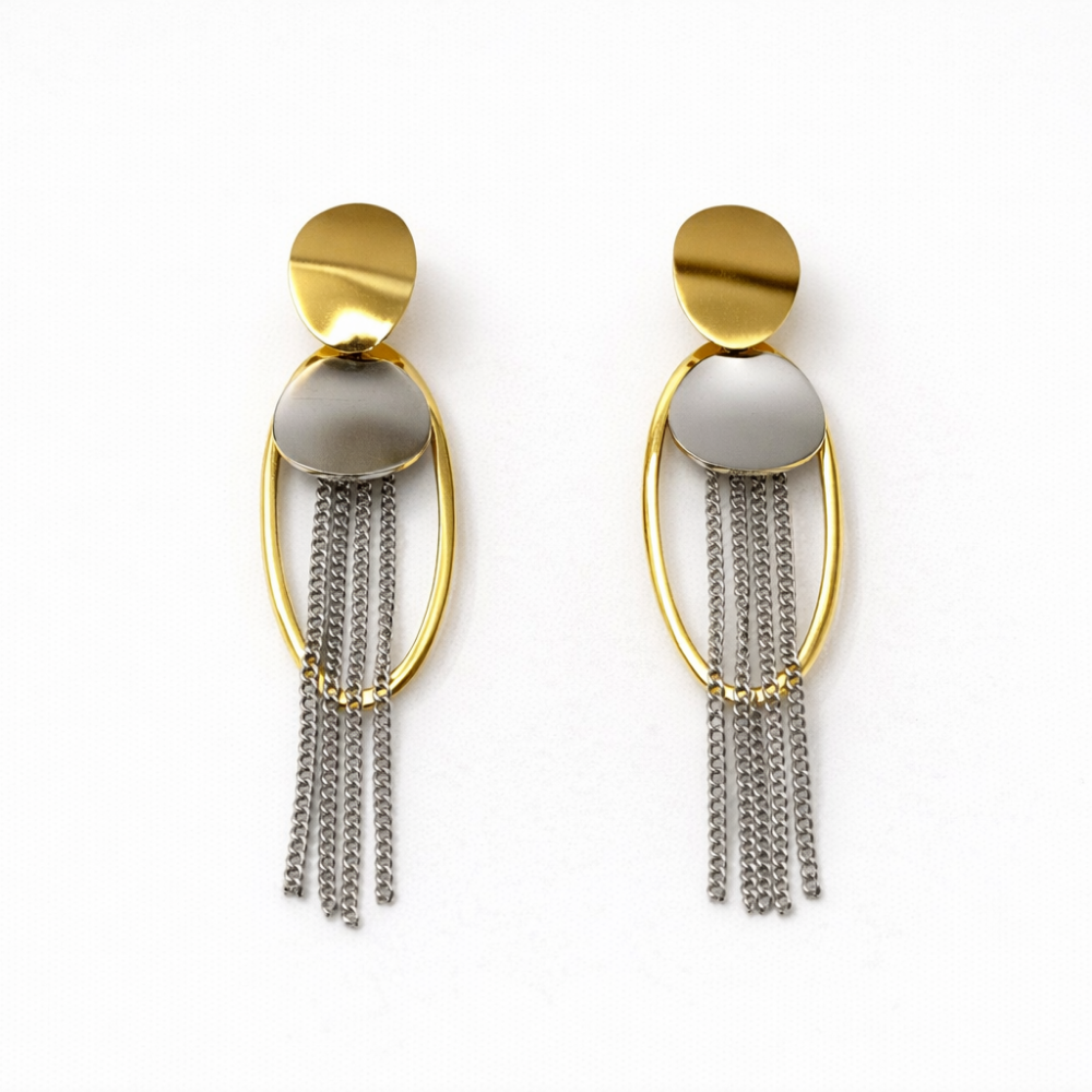 These statement earrings feature a sleek oval frame in polished gold tone, paired with a contrasting silver-tone circular accent for a bold dual-tone effect. From the center, multiple fine chain tassels cascade downward, creating fluid movement and a sophisticated silhouette. The smooth top stud ensures a secure fit, while the elongated drop design adds elegance without feeling heavy.