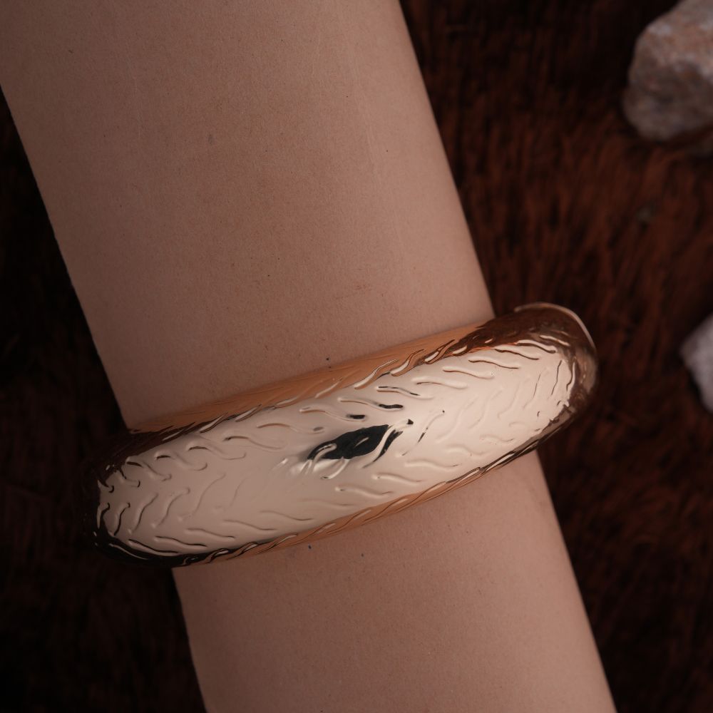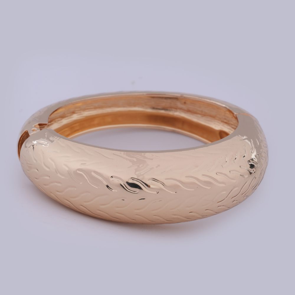 Elevate your style with this elegant gold-toned bangle bracelet, crafted with a smooth yet subtly textured surface that adds depth and sophistication. The bracelet features a bold, rounded design with a glossy finish, making it a standout accessory for both casual and formal occasions. Its sturdy construction ensures durability, while the refined pattern detail adds a unique artistic touch.