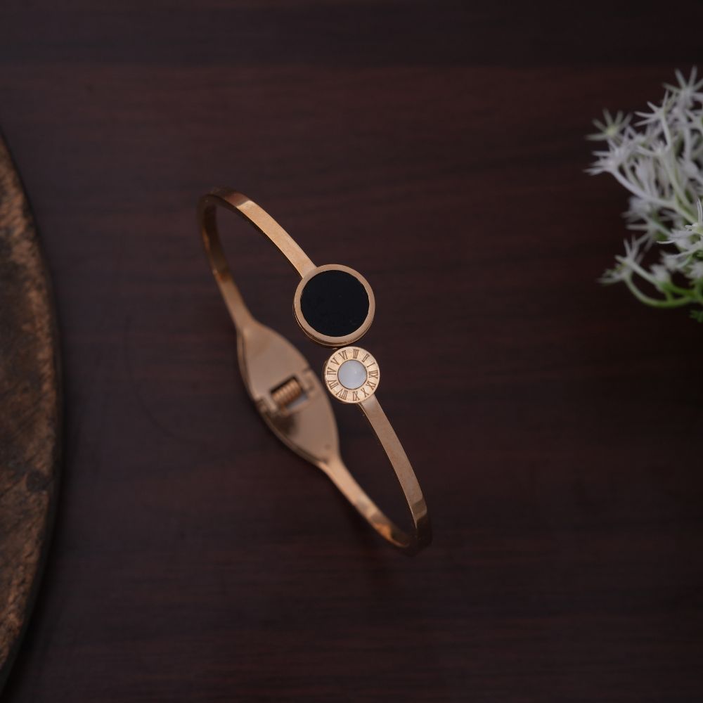 - Sleek golden bracelet with dual round accents (black & pearl-white)