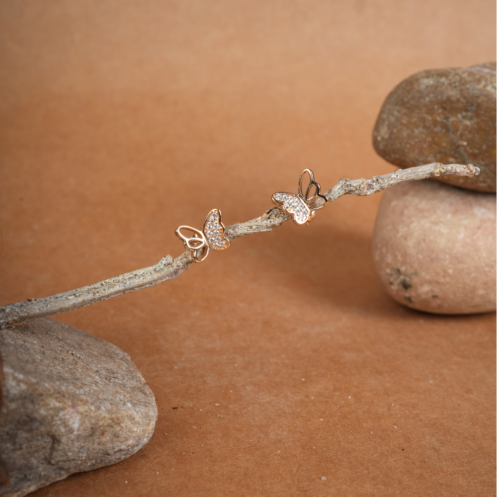 Capture the beauty of nature with these delicate Enchanted Butterfly Stud Earrings. Crafted with a whimsical design, these studs feature a charming butterfly silhouette finished in a radiant rose gold polish. One wing is kept open and airy with a smooth outline, while the other is brilliantly pavé-set with sparkling cubic zirconia (CZ) stones, adding a touch of sophisticated shimmer.