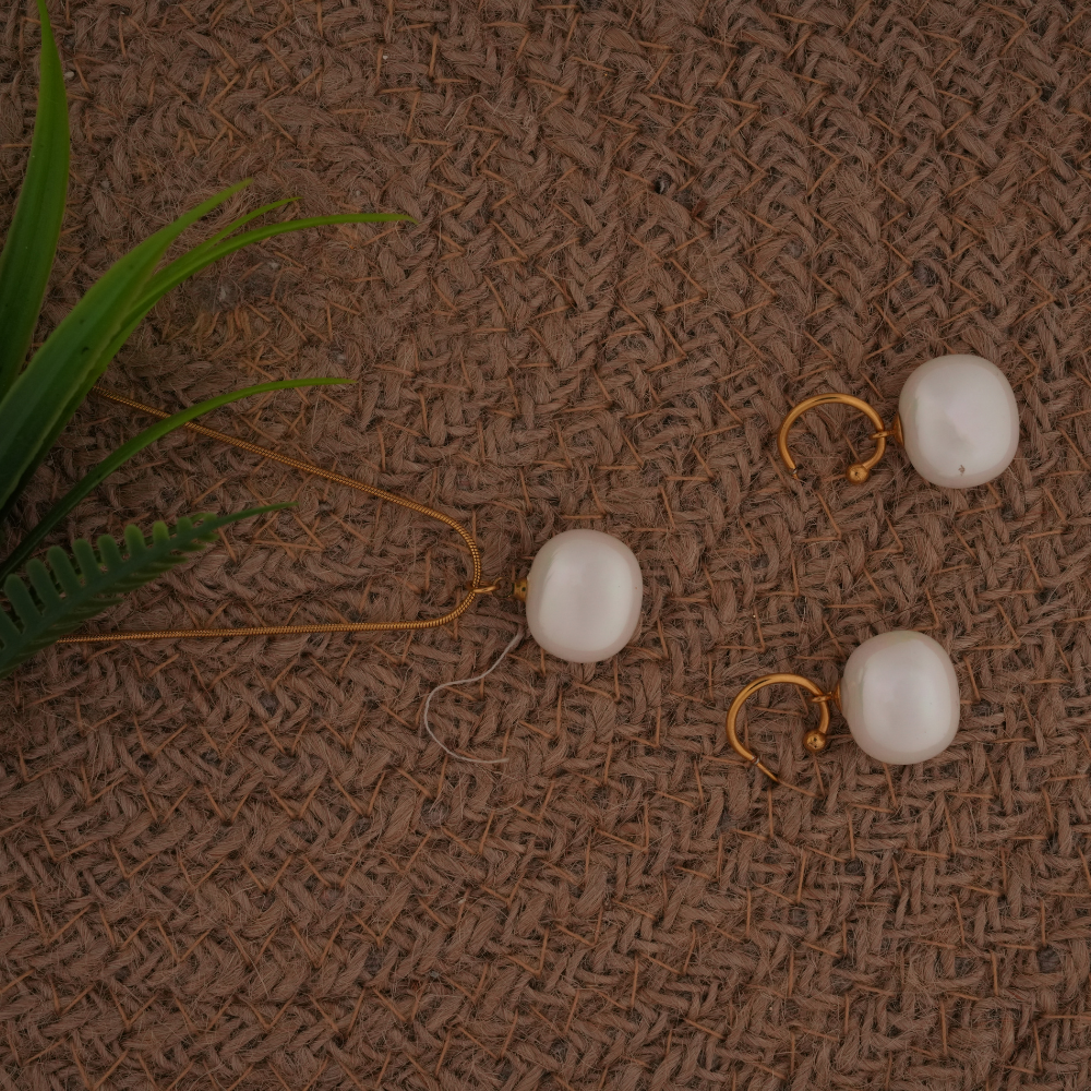 Each piece centers around a luminous, baroque-style pearl, admired for its natural, irregular shape that makes every set unique. The soft white or cream tones of the pearls radiate understated luxury, offering a modern twist on the classic pearl look.