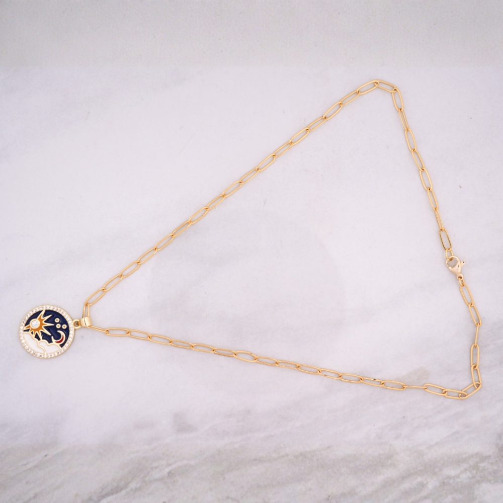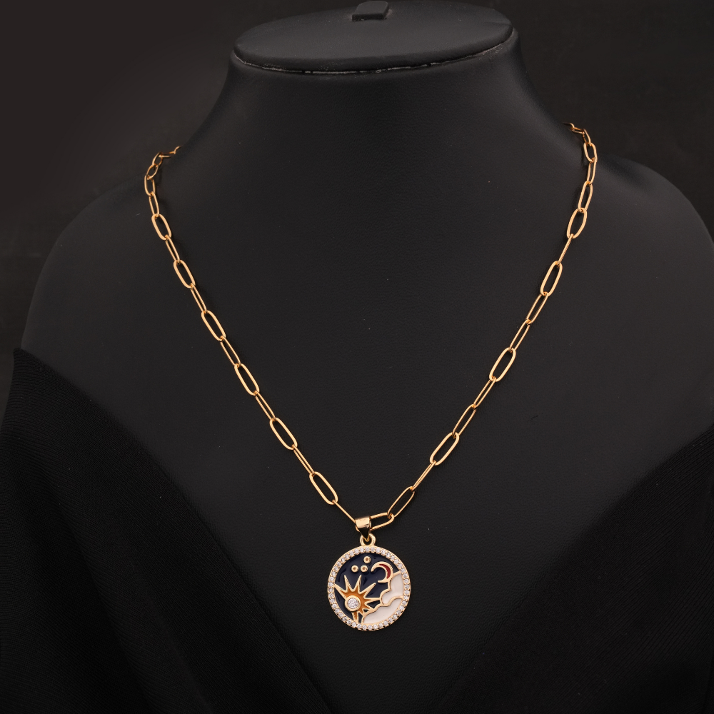 This necklace features a bold gold-tone paperclip chain, known for its contemporary silhouette and effortless sophistication. At its center hangs a round medallion pendant that captures the enchanting beauty of the cosmos.