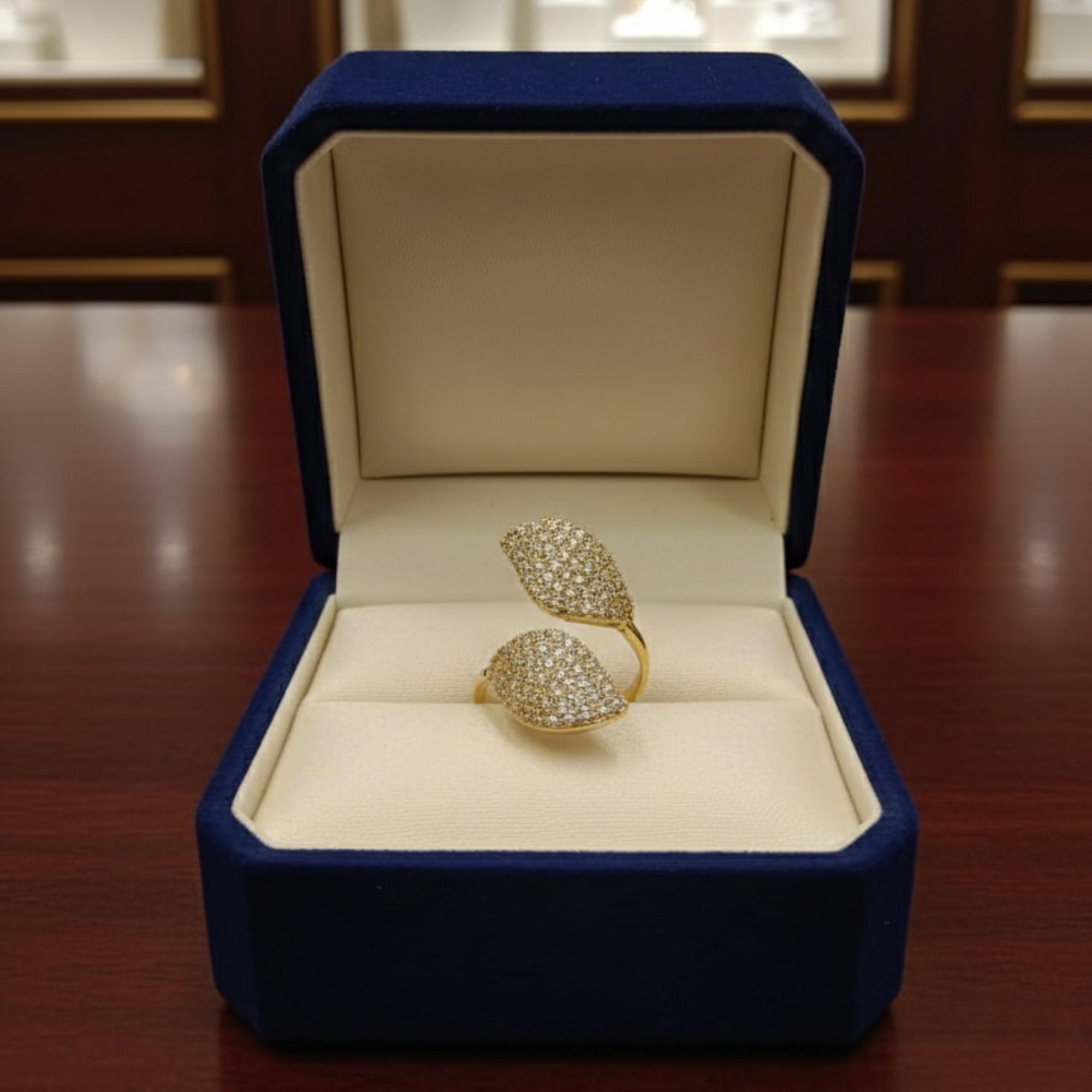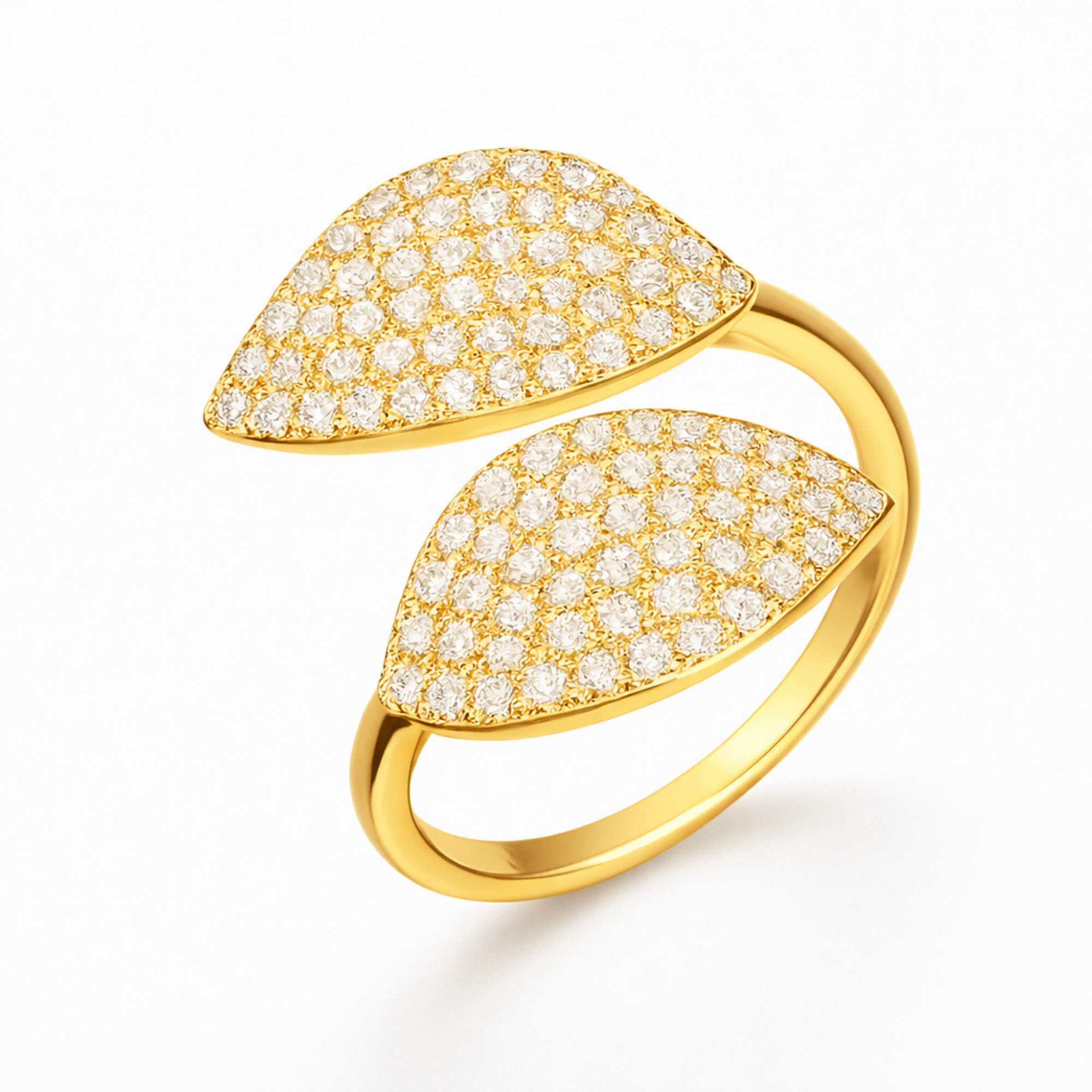 This statement ring features two marquise-shaped leaf motifs positioned in a balanced open design, each encrusted with shimmering pavé-set crystals for a dazzling, light-catching finish. The curved gold-tone band flows seamlessly into the twin leaf forms, creating a sculptural and feminine silhouette. The high-polish gold finish enhances the brilliance of the stones, delivering a luminous, premium look. Its open-band structure ensures comfort and flexibility, making it perfect for both everyday elegance and special occasions.