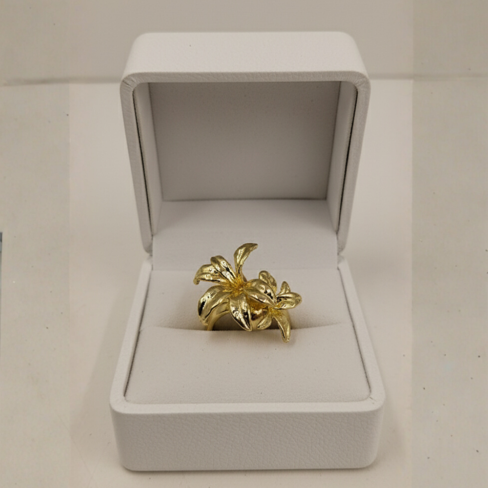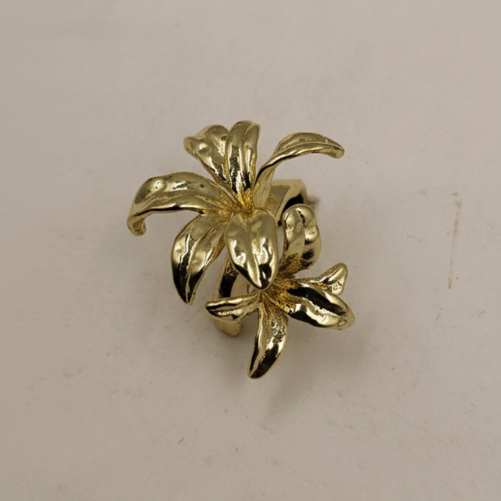 Bring timeless floral elegance to your jewelry collection with this stunning Gold-Tone Dual Lily Bloom Ring. Expertly sculpted to showcase two delicately intertwined lilies, this ring captures the natural grace and vitality of blooming flowers in full form. Each petal is gracefully curved with subtle texturing, giving the piece a lifelike and sophisticated charm.