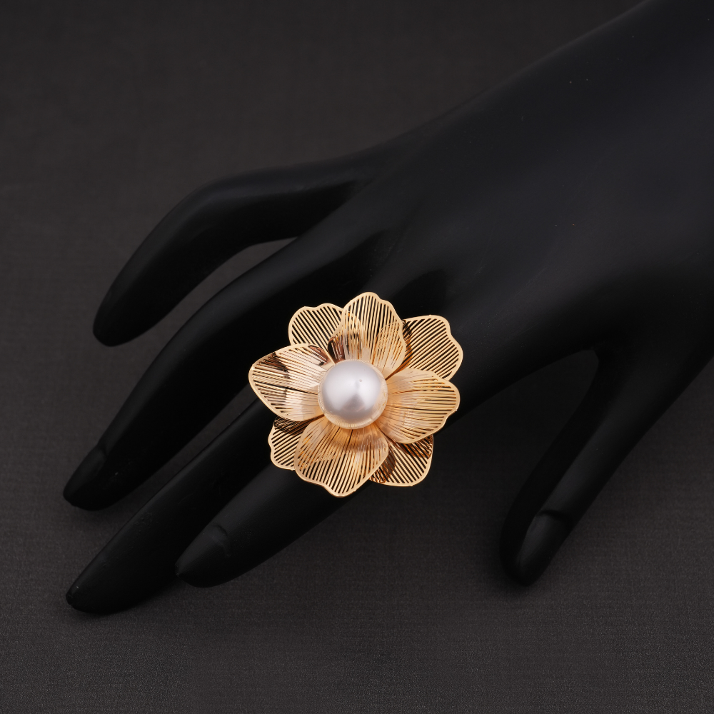 Inspired by the natural beauty of blooming petals, this ring showcases intricately textured gold-tone petals layered to form a graceful open flower. At the heart of the design rests a lustrous white pearl, creating a harmonious balance of shine and softness. The petal contours feature fine ribbed detailing that reflects light beautifully, enhancing the depth and craftsmanship of the design.