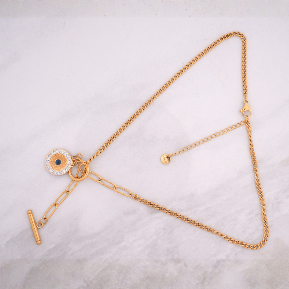Statement Pendant: Toggle clasp doubles as a circular charm with central dark stone and sparkling accents.