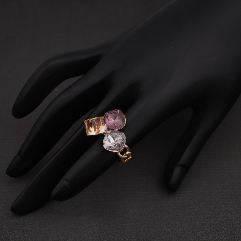 This exquisite piece highlights three distinct cushion and round-cut crystals, each uniquely positioned to create a dynamic, eye-catching arrangement. The interplay of colors evokes warmth, romance, and radiance—making it a perfect statement piece for both day and evening wear. The polished gold-tone band enhances the brilliance of each stone, ensuring that every angle catches the light beautifully.