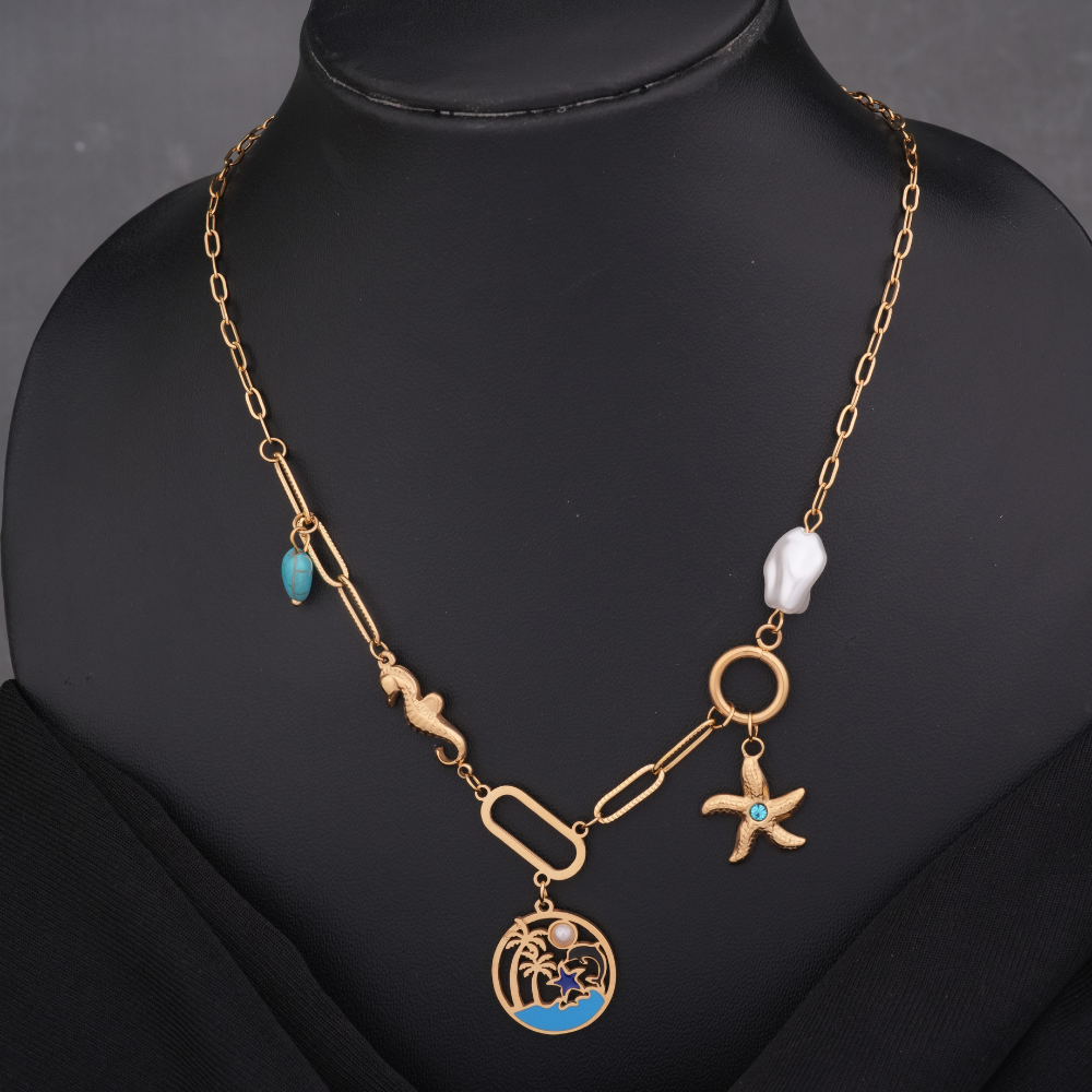 Channel seaside elegance and tropical charm with the Gold-Tone Ocean Charm Necklace, a whimsical, asymmetrical statement piece inspired by the beauty of the sea. With its mix of textures, shapes, and colors, this necklace captures the carefree spirit of summer and coastal getaways.
