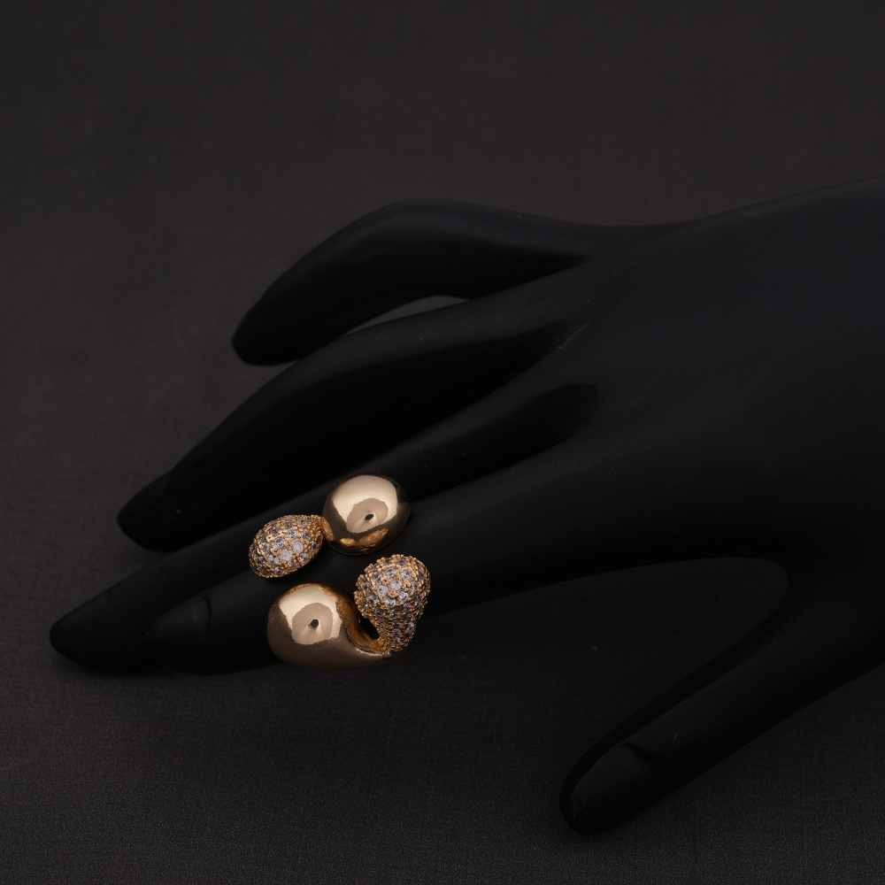 Embrace bold, contemporary luxury with this striking Gold-Tone Pavé & Domed Ball Statement Ring — a captivating fusion of sculptural design and refined elegance. Crafted with precision, this ring features a modern open-cuff silhouette that gracefully wraps around the finger, showcasing an asymmetrical balance of texture, shine, and form.