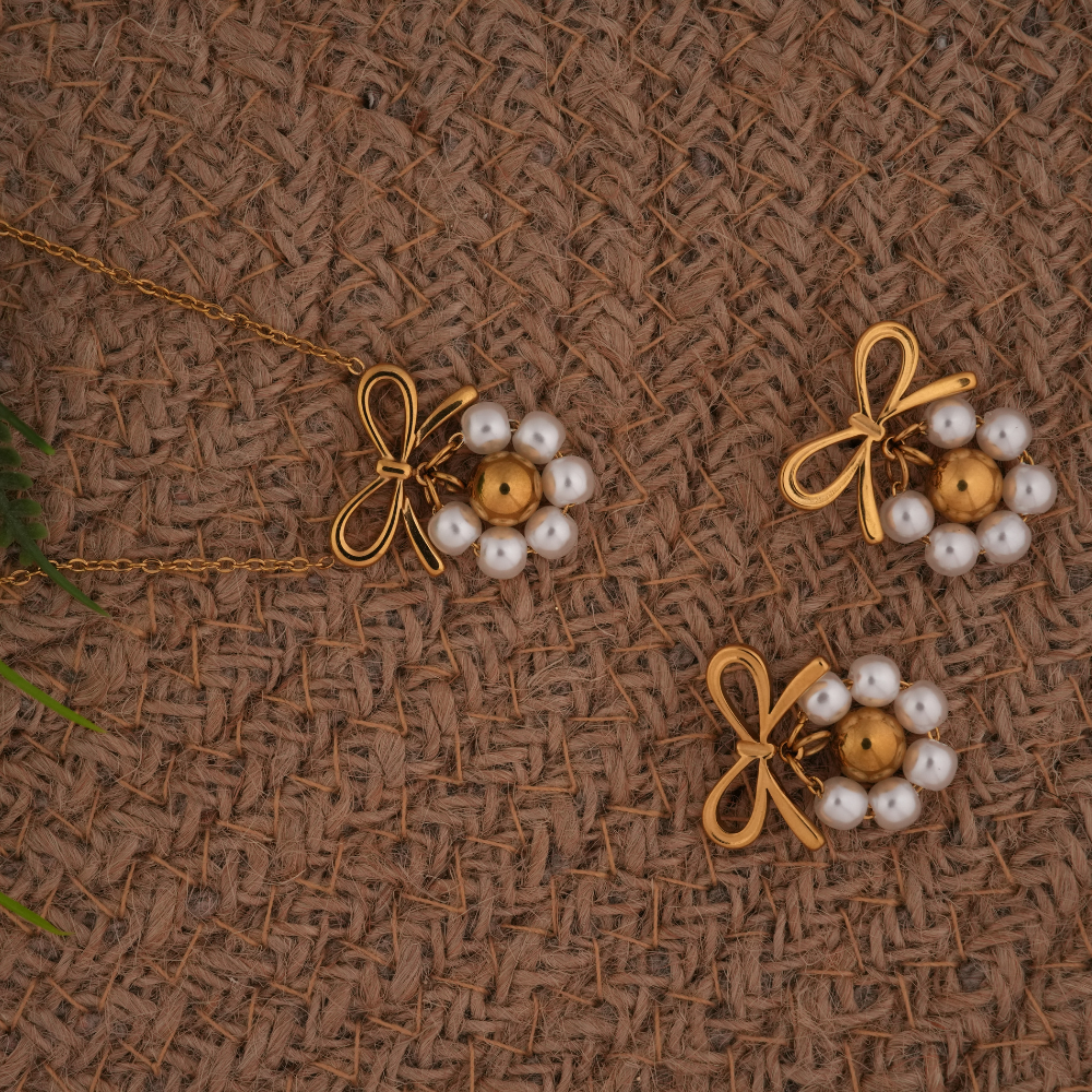The matching earrings mirror the necklace’s motif — petite pearl clusters topped with the same elegant gold bow. Designed as neat stud earrings, they sit perfectly on the earlobes, completing the set with effortless coordination.