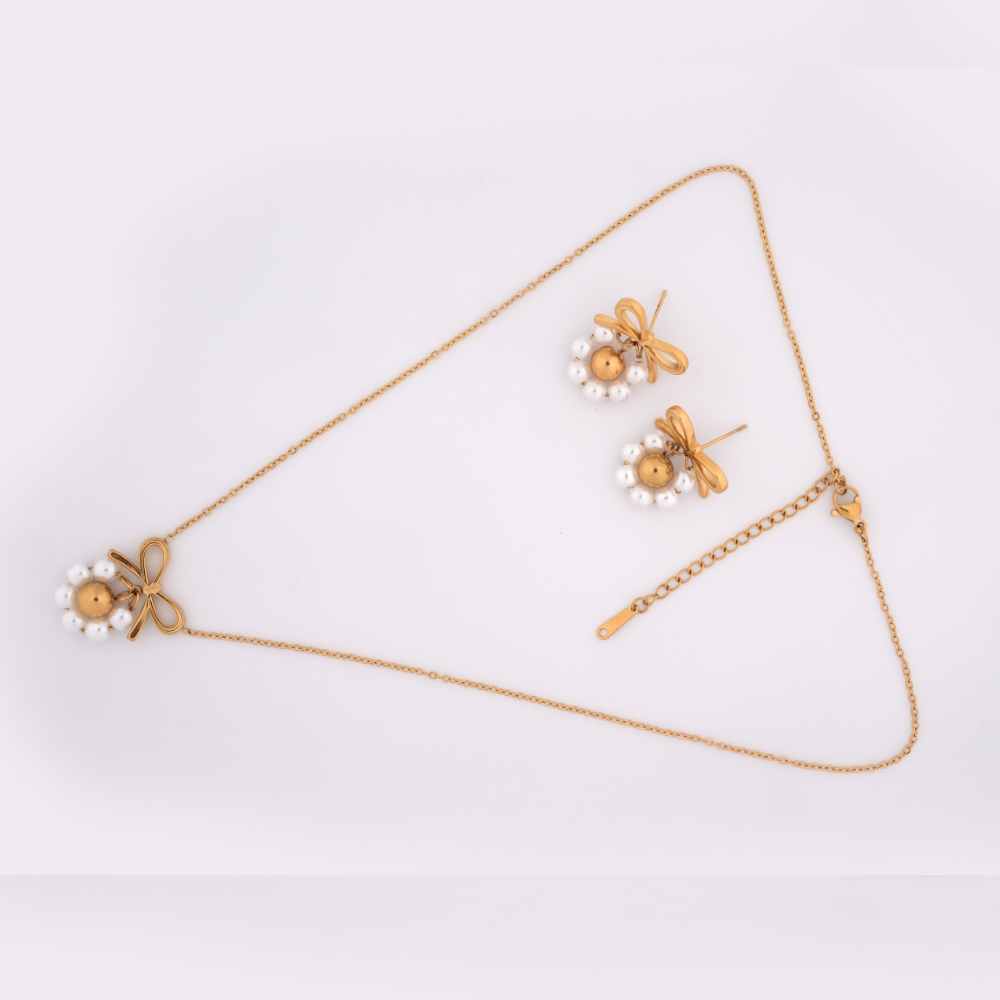 Add a touch of timeless charm and femininity to your look with the Gold-Tone Pearl Cluster & Bow Jewelry Set. Delicate, graceful, and playfully elegant, this set beautifully combines classic pearls with a modern twist — perfect for adding a hint of sophistication to any outfit.