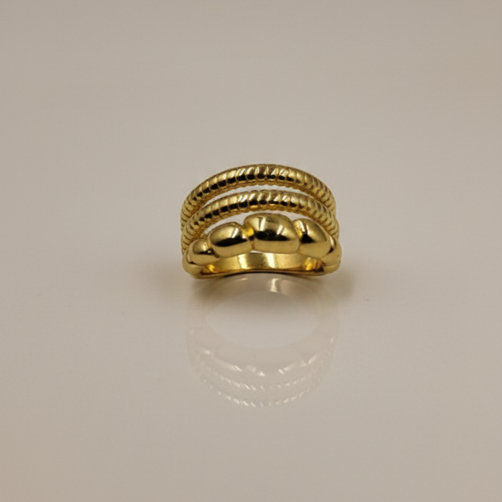 Add a touch of bold sophistication to your jewelry collection with this Gold-Tone Textured Adjustable Band Ring. Designed with intricate detailing and layered textures, this ring brings a modern yet timeless edge to your look. The top of the band features fine ridged patterns, while the lower section showcases a smooth, domed link-inspired design—creating a rich interplay of shine and depth.