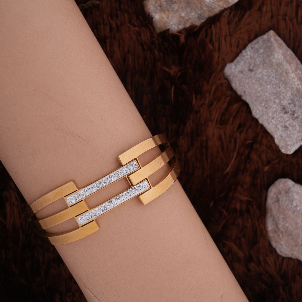 Crafted from high-quality alloy with a polished golden finish, it ensures durability while remaining lightweight and comfortable on the wrist. The secure clasp closure keeps it firmly in place, making it ideal for both day and evening wear.