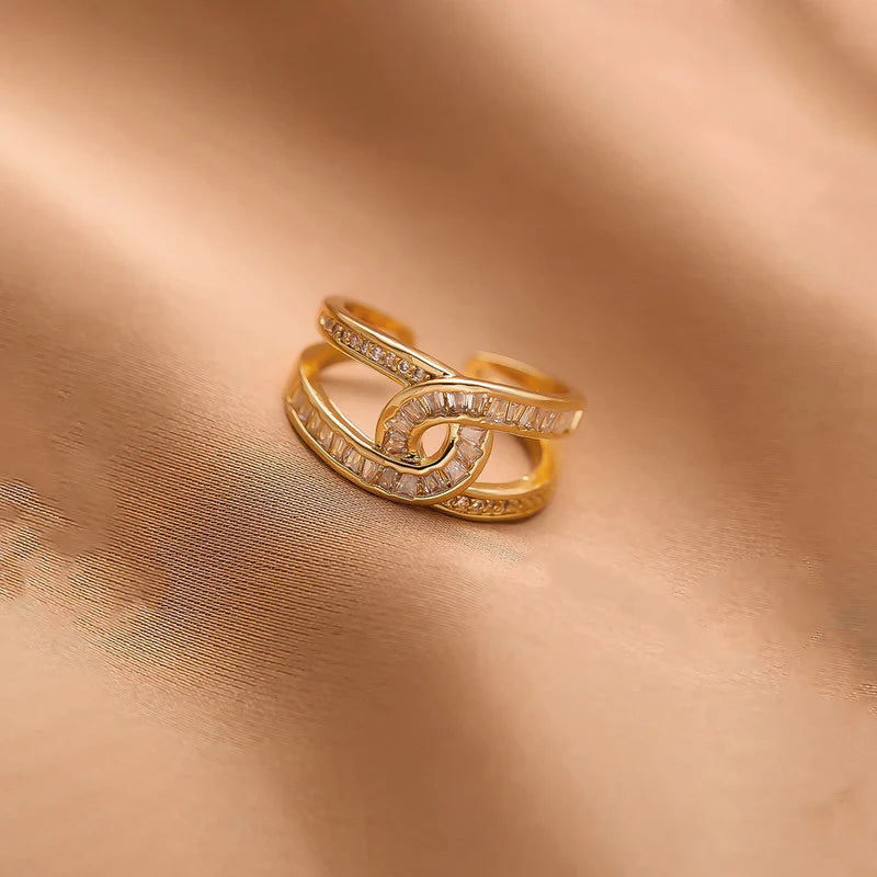 This beautifully crafted open ring features intertwining looped bands that form an infinity-inspired silhouette, representing continuity and balance. One band is accented with precision-set crystals, adding a soft yet eye-catching shimmer, while the smooth polished bands create a graceful contrast. The adjustable open design ensures comfort and a perfect fit, finished with a luxurious gold-tone polish.