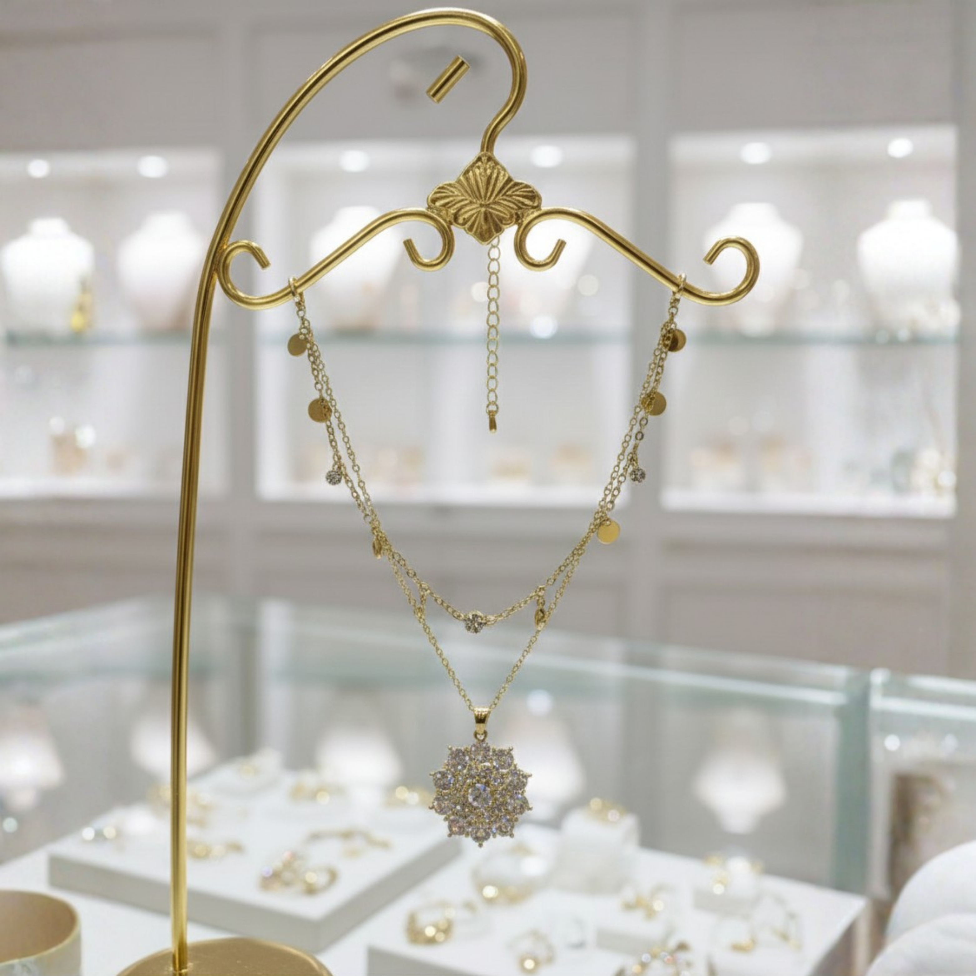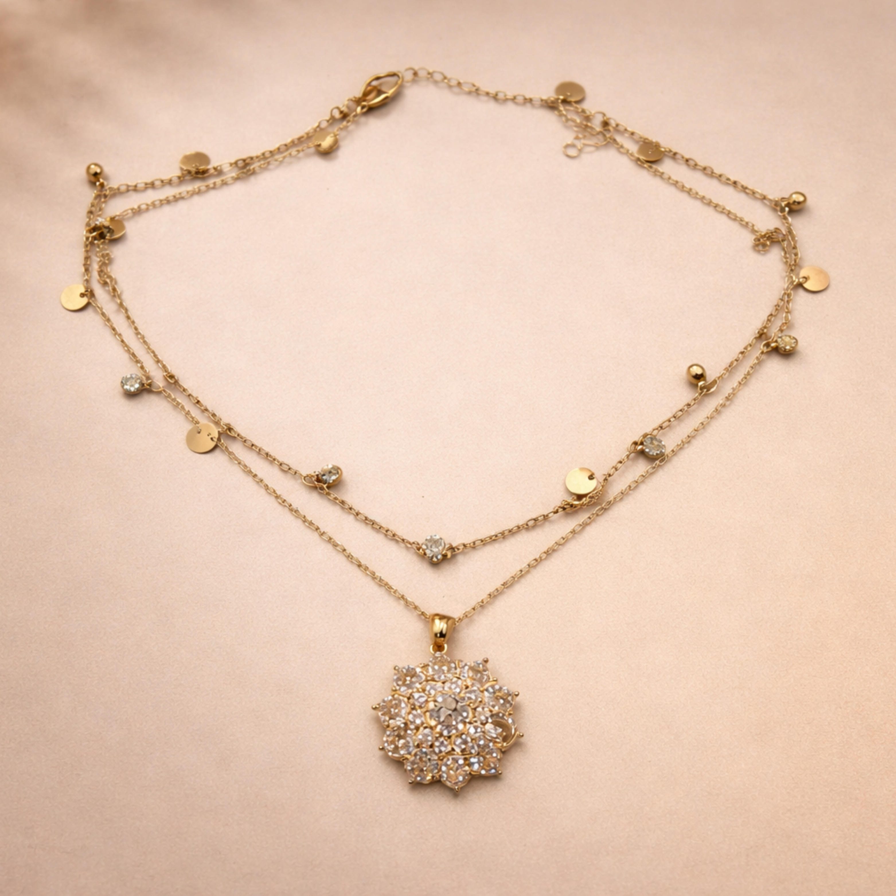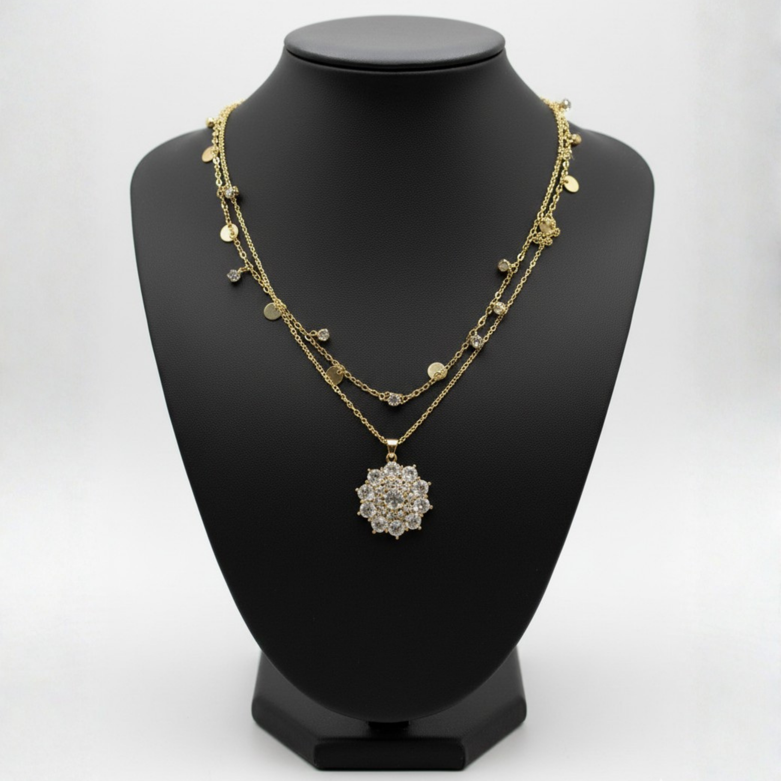 This necklace features a beautifully layered gold-tone chain design. The upper layer is adorned with tiny crystal accents and polished gold discs that add subtle movement and shine, while the lower layer highlights a floral-inspired crystal medallion pendant. The clustered crystals create a luminous focal point, perfectly balanced by the lightweight, flowing chains for an elegant neckline finish.