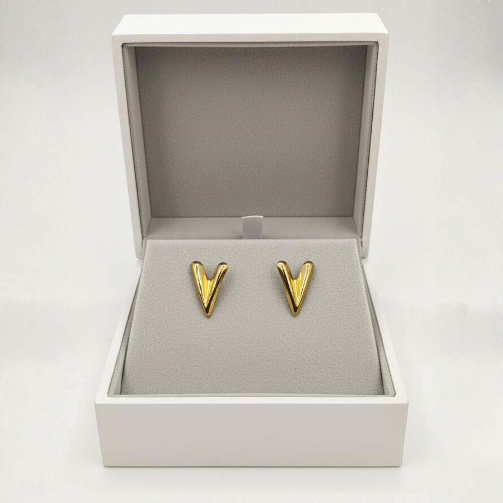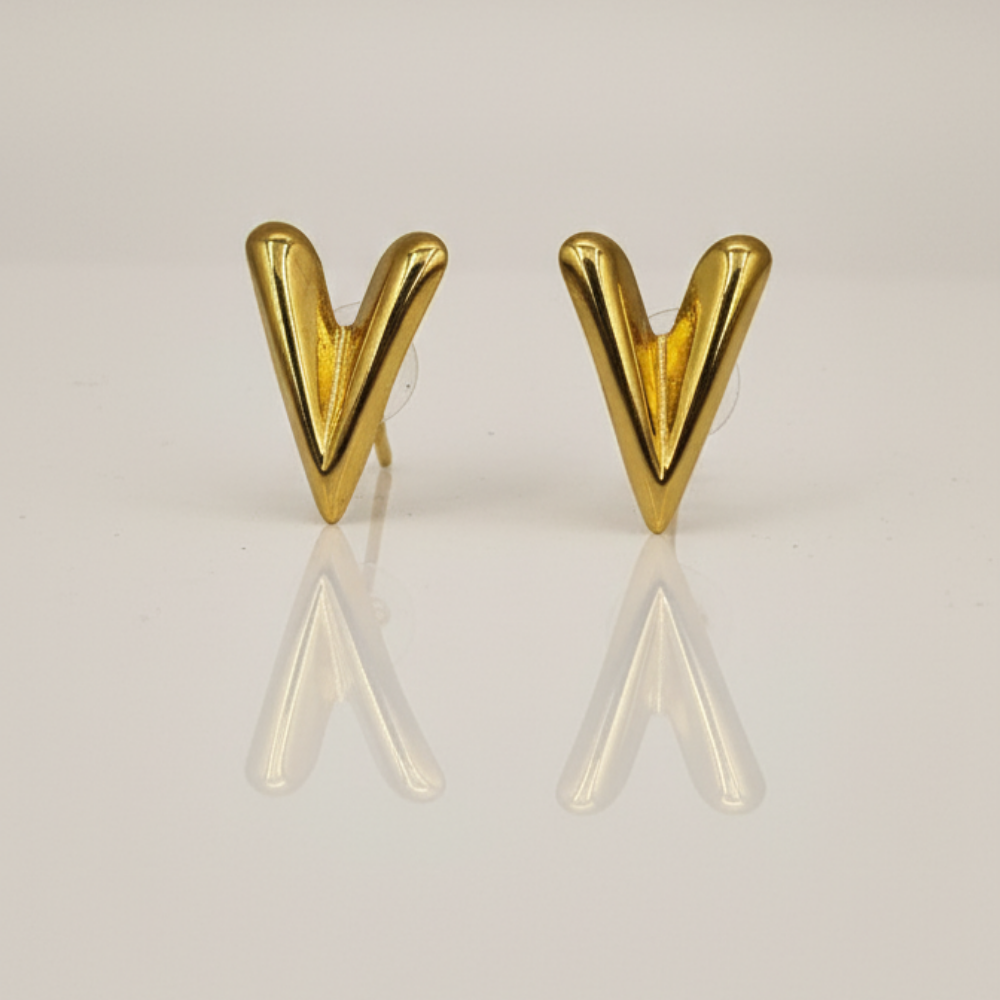 These studs feature a bold inverted V-shape silhouette, sculpted to create a three-dimensional look that catches the light from every angle. The smooth, mirror-polished gold-tone finish highlights the sharp, clean lines, making them a true statement of modern artistry. Their minimalist profile ensures effortless pairing with other accessories, while maintaining a chic, standalone presence.