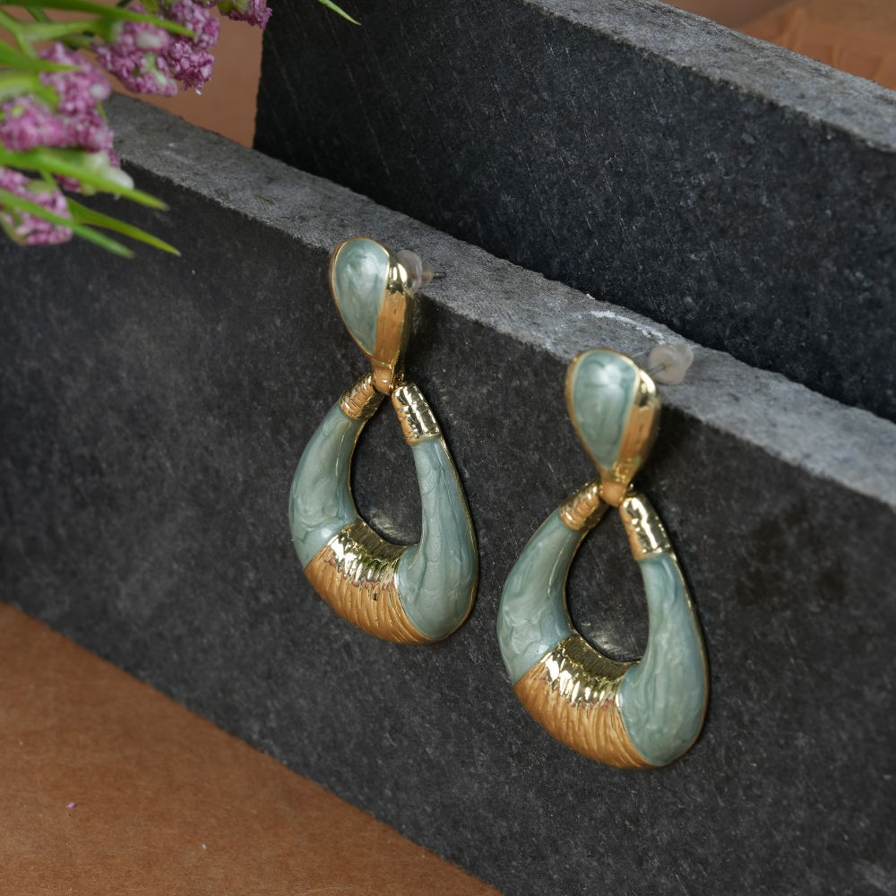 Elevate your look with the clean lines and subtle color of these Modern Color-Blocked Teardrop Dangle Earrings. The design features two linked pieces: a smaller, curved gold-tone stud and a larger, open teardrop-shaped dangle. Both pieces incorporate smooth sage green or slate blue enamel contrasted perfectly with polished gold-tone metal. The lower piece features an artistic, color-blocked design, where the enamel outlines and partially fills the loop, leaving sections of highly polished gold exposed, creating a dynamic and stylish effect.
