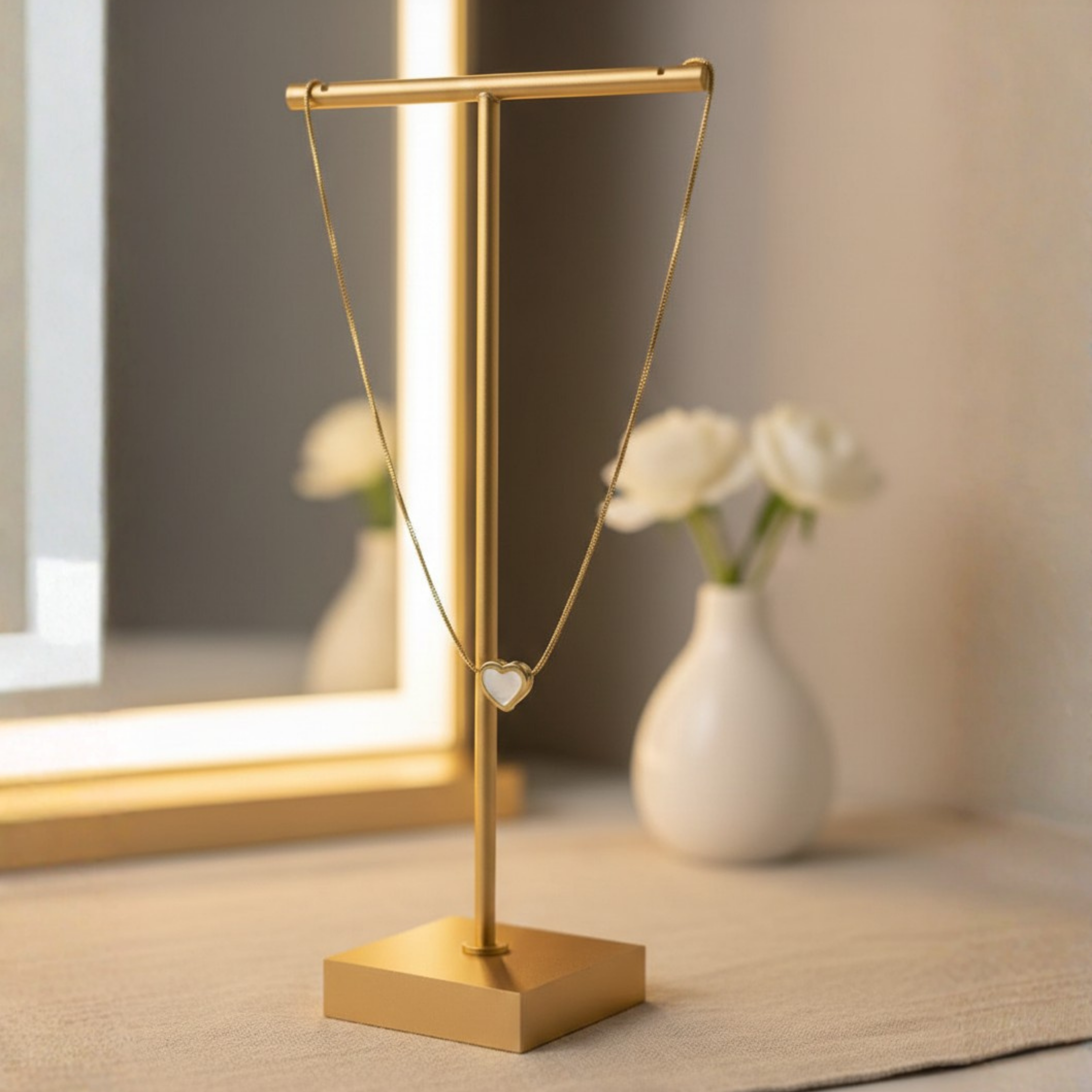 This delicate necklace features a sleek gold-tone chain paired with a petite heart-shaped pendant in luminous mother-of-pearl. The smooth, iridescent surface reflects light beautifully, creating a subtle glow that feels graceful and feminine. Its clean, minimal design makes it easy to wear alone or layer with other necklaces for a modern look.