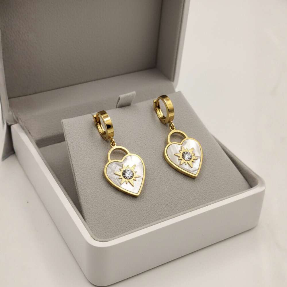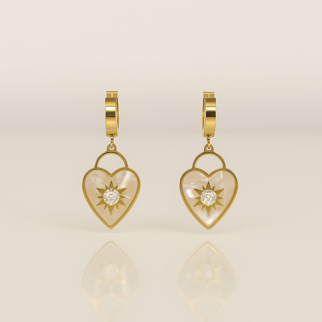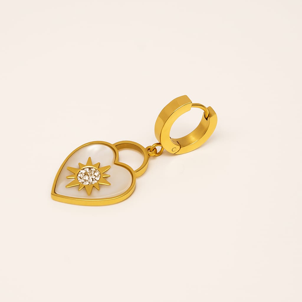Crafted with exquisite attention to detail, each earring highlights a glossy heart-shaped mother-of-pearl inlay that reflects light with a natural, soft iridescence. The golden sun motif at the center beautifully contrasts against the pearlescent base, while a round crystal brings sparkle and depth. Suspended from sleek gold-tone huggie hoops, the heart pendants sway gracefully, offering fluid movement and refined allure.