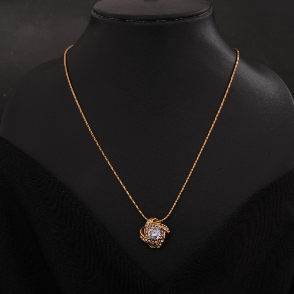 The pendant features a dazzling round solitaire stone (likely cubic zirconia) at its center, cradled by an intricate love-knot-inspired setting. Twisted strands of gold-tone metal interlace gracefully, each paved with shimmering accent stones for a subtle yet captivating sparkle. A matching gold-tone bail connects the pendant to a fine, polished chain, completing this elegant, symbolic design.