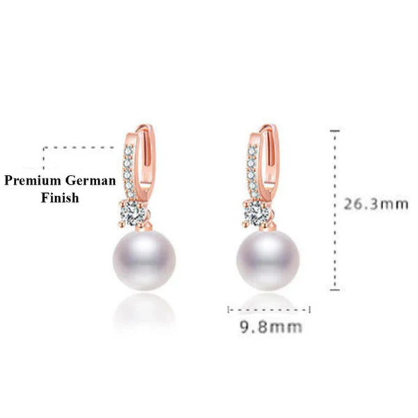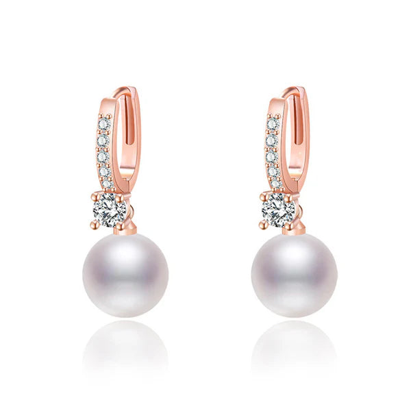 These elegant earrings feature sleek rose gold-tone mini hoops, delicately embellished with a line of sparkling crystal accents for subtle brilliance. Suspended below each hoop is a round, luminous pearl drop, paired with a single crystal connector that enhances the overall shine. The gentle contrast of warm rose gold, radiant crystals, and soft pearl creates a timeless, feminine silhouette that moves beautifully with every step.