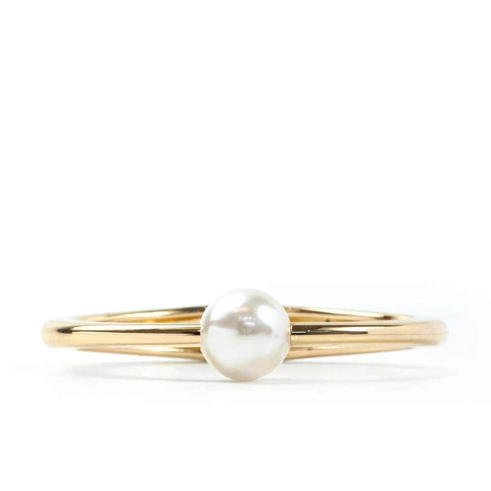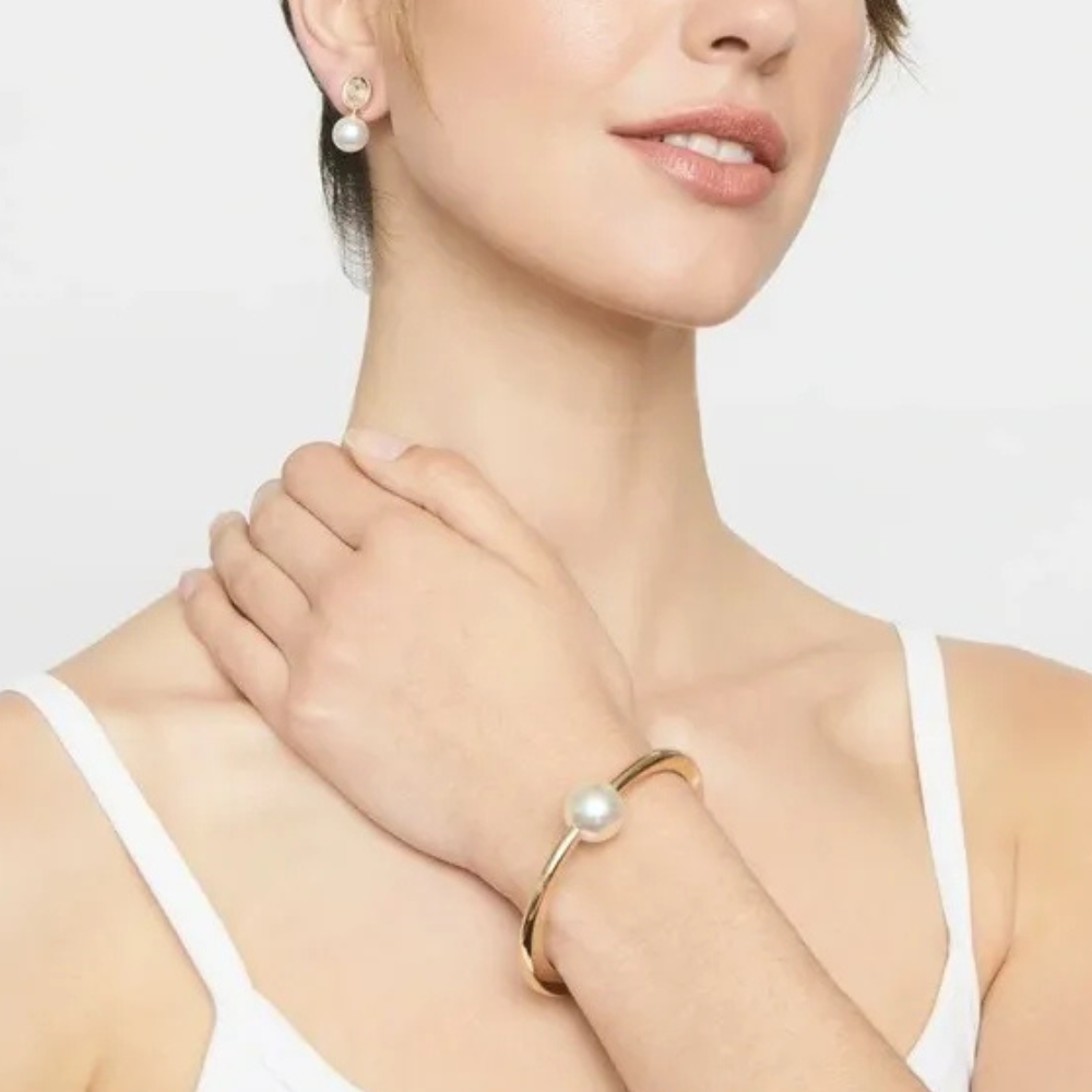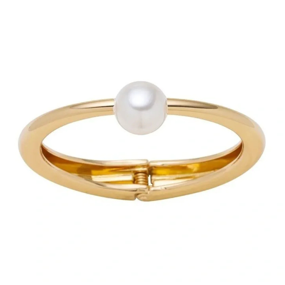 A sleek gold-tone oval bangle finished with a soft pearl drop detail that adds a touch of classic charm. The pearl creates a beautiful focal point while keeping the overall design refined and sophisticated.