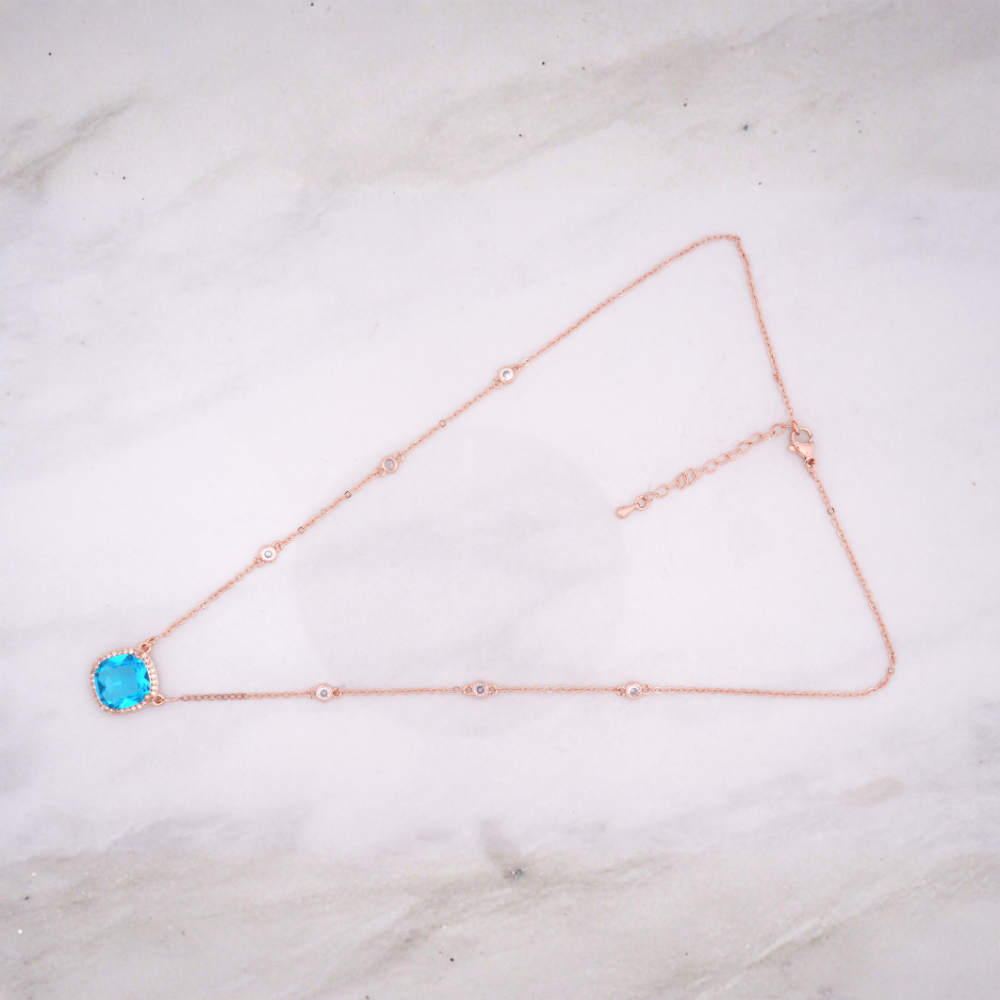 At the heart of this necklace lies a brilliant cushion-cut blue gemstone — faceted to perfection for maximum light reflection and depth. The stone is encircled by a fine halo of pavé-set clear crystals that add an extra glimmer of brilliance.