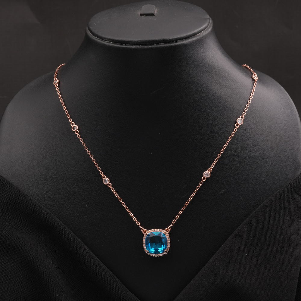 Radiate timeless sophistication with the Rose Gold-Tone Blue Cushion-Cut Halo Pendant Necklace, a captivating piece that blends classic design with a touch of modern glamour. Its vivid blue gemstone and delicate rose-gold finish create an effortlessly elegant look — perfect for special occasions or everyday refinement.