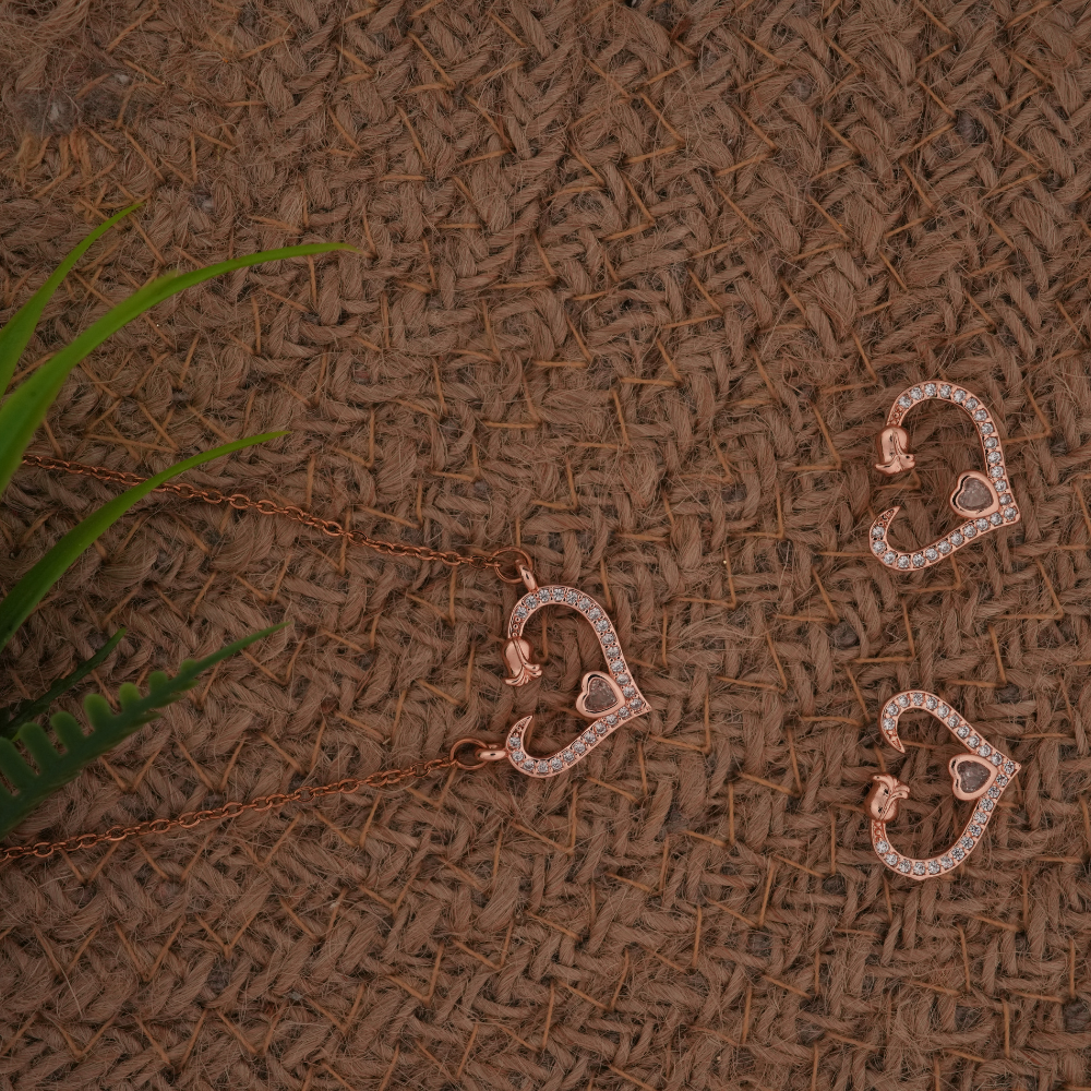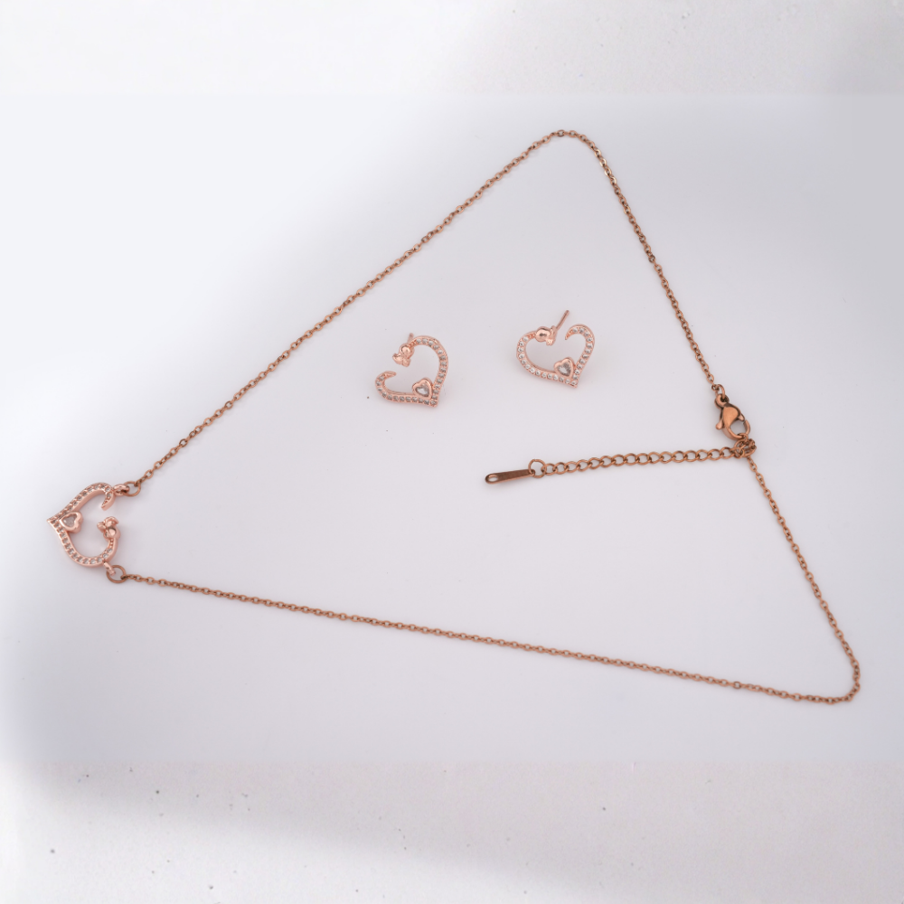 Celebrate love and elegance with this Rose Gold-Tone Sparkling Heart Necklace and Earring Set — a graceful expression of romance, femininity, and timeless charm. Crafted with a warm rose gold hue and adorned with dazzling stones, this set radiates affection and sophistication.