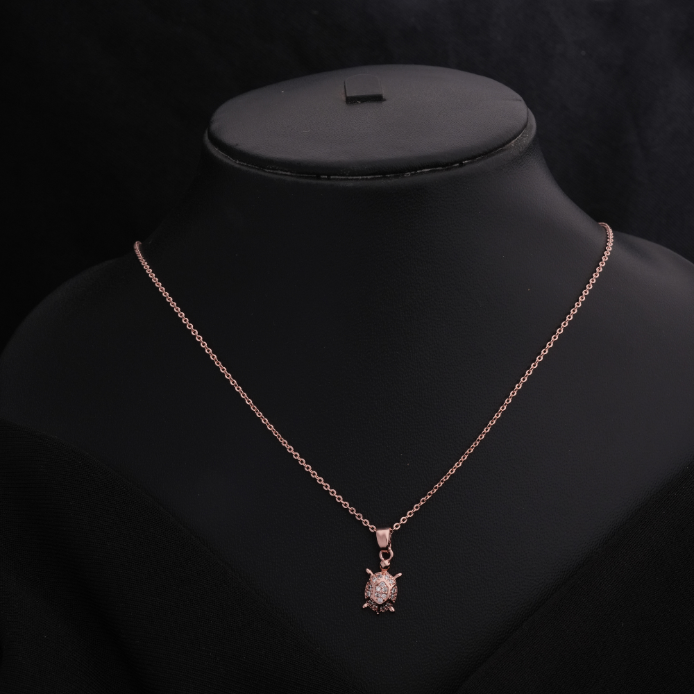 The necklace features a fine, rose gold-tone cable or link chain that gracefully showcases a tiny, intricately detailed turtle pendant. The turtle’s shell and body are adorned with pavé-set white stones (likely cubic zirconia or crystals), adding a touch of sparkle that catches the light beautifully. The warm rose gold-tone finish enhances the necklace’s delicate, feminine aesthetic, while the petite charm maintains a playful yet elegant look.