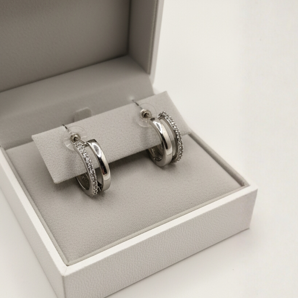 Elevate your modern jewelry lineup with these Silver-Tone Double Band Pave Hoop Earrings, crafted for those who appreciate clean lines, refined sparkle, and contemporary elegance. Their dual-band design offers a sleek layered look, delivering understated glamour suited for both everyday sophistication and evening allure.