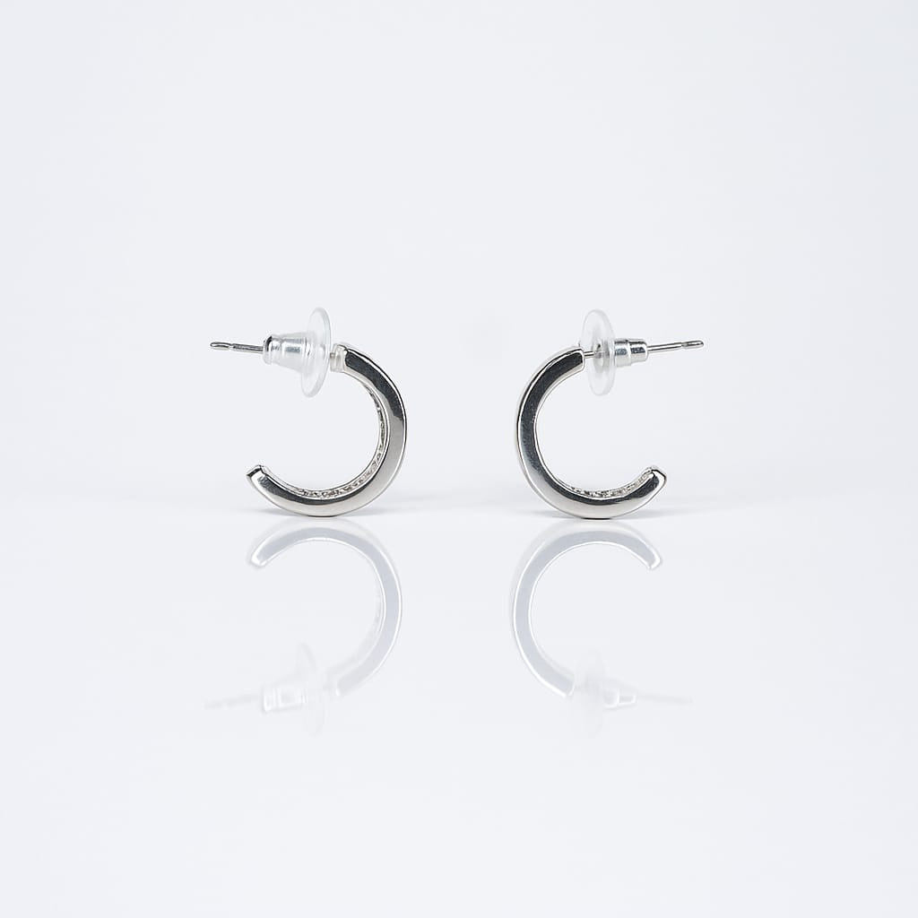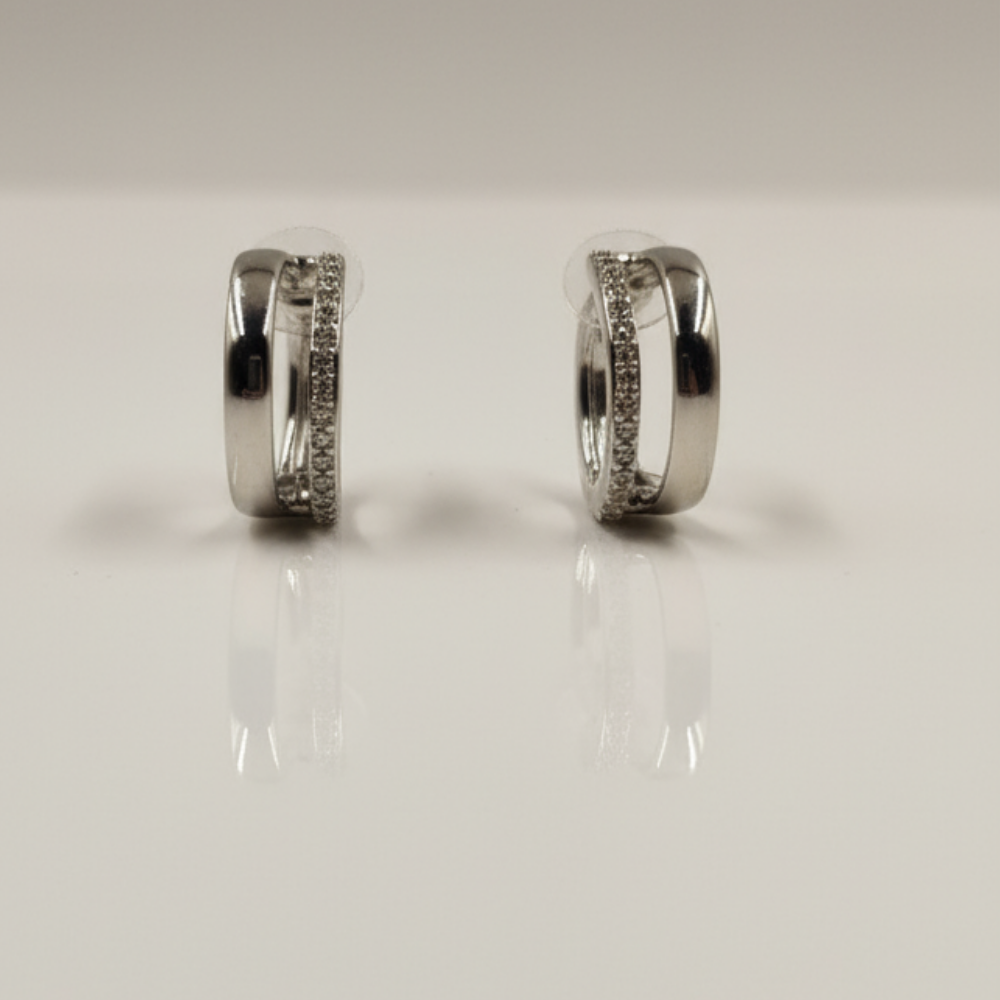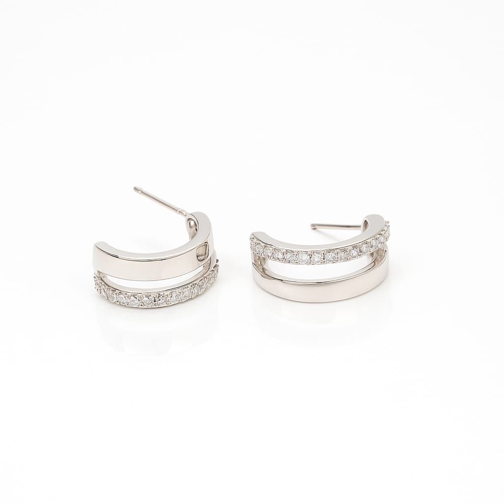 These earrings feature a double-row open-band structure, creating a modern stacked-hoop effect. One band is adorned with brilliant pave-set stones, adding light-catching sparkle, while the second band maintains a smooth polished finish for balanced contrast. The semi-hoop silhouette curves gracefully around the ear, offering a chic and sculptural profile. Crafted in high-shine silver-tone metal, the earrings showcase a luxurious, mirror-like luster that pairs seamlessly with any style.