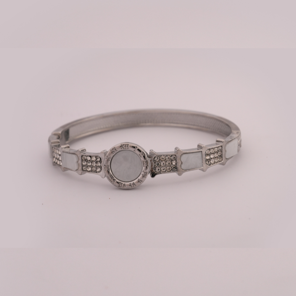 Crafted from high-quality silver-tone alloy, the bracelet showcases a smooth metallic polish paired with pearl-white inlays and crystal accents for a touch of radiance. Each stone is meticulously set to ensure brilliance and longevity.