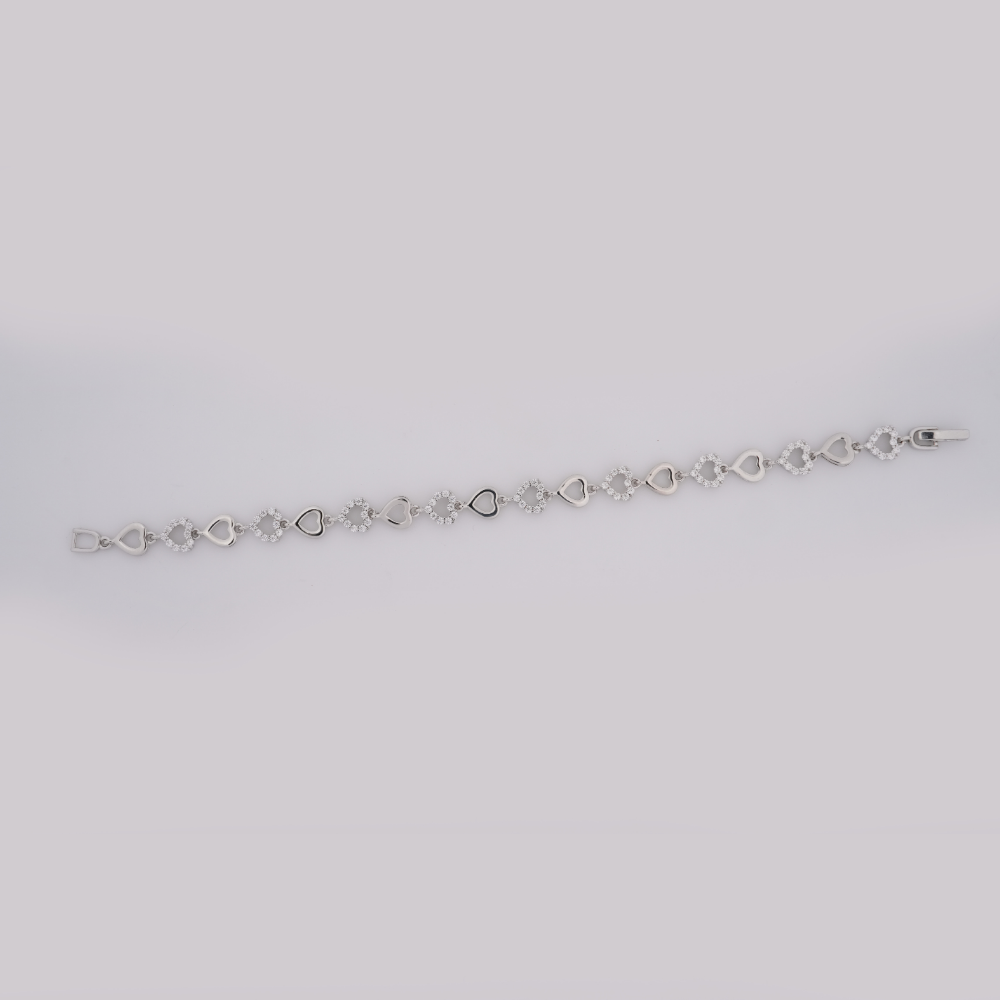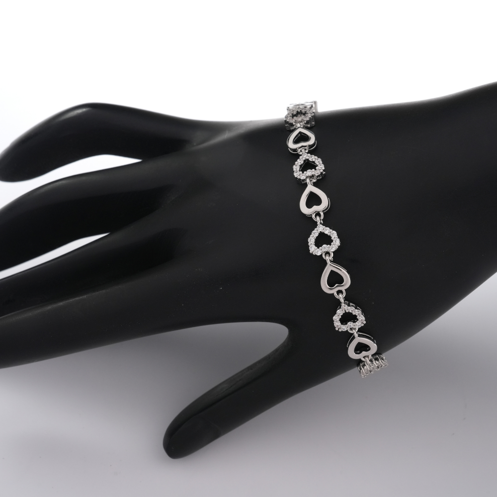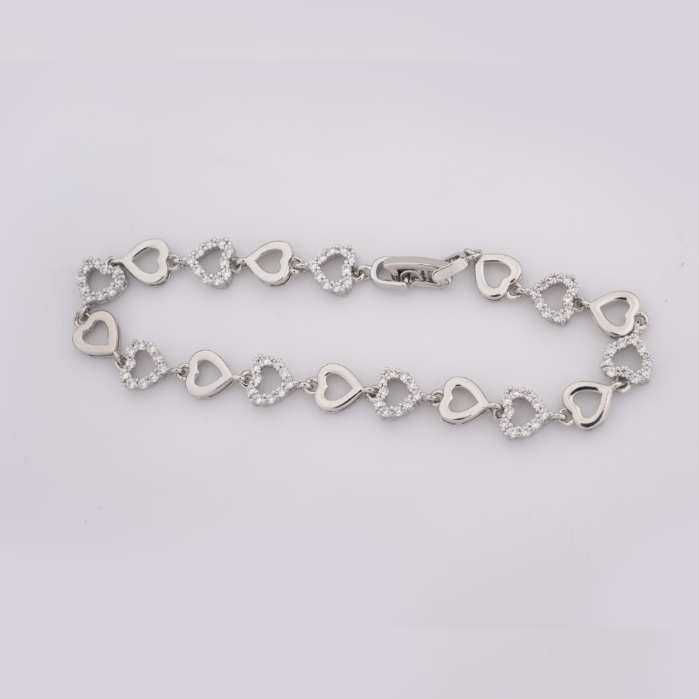 The bracelet features a graceful sequence of open heart links alternating with solid hearts adorned in clear, sparkling stones. This pattern creates a fluid rhythm of shine and texture, embodying both simplicity and charm.