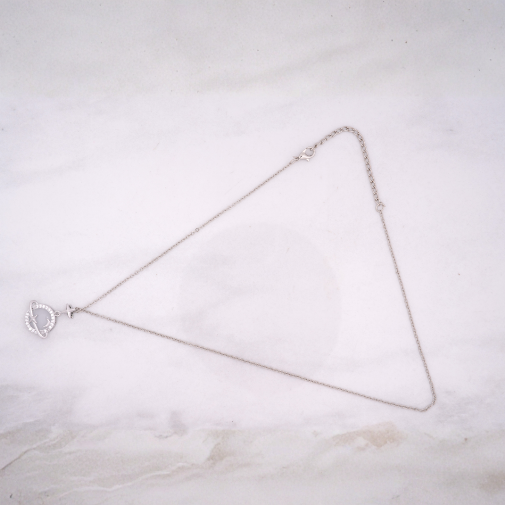 The necklace features a beautifully sculpted circular pendant inspired by Saturn’s iconic ringed silhouette. At its center rests a delicate star and crescent moon motif — symbols of wonder, dreams, and balance. The surrounding circular frame is partially lined with pavé-set clear stones that catch the light with every movement, adding just the right touch of sparkle.