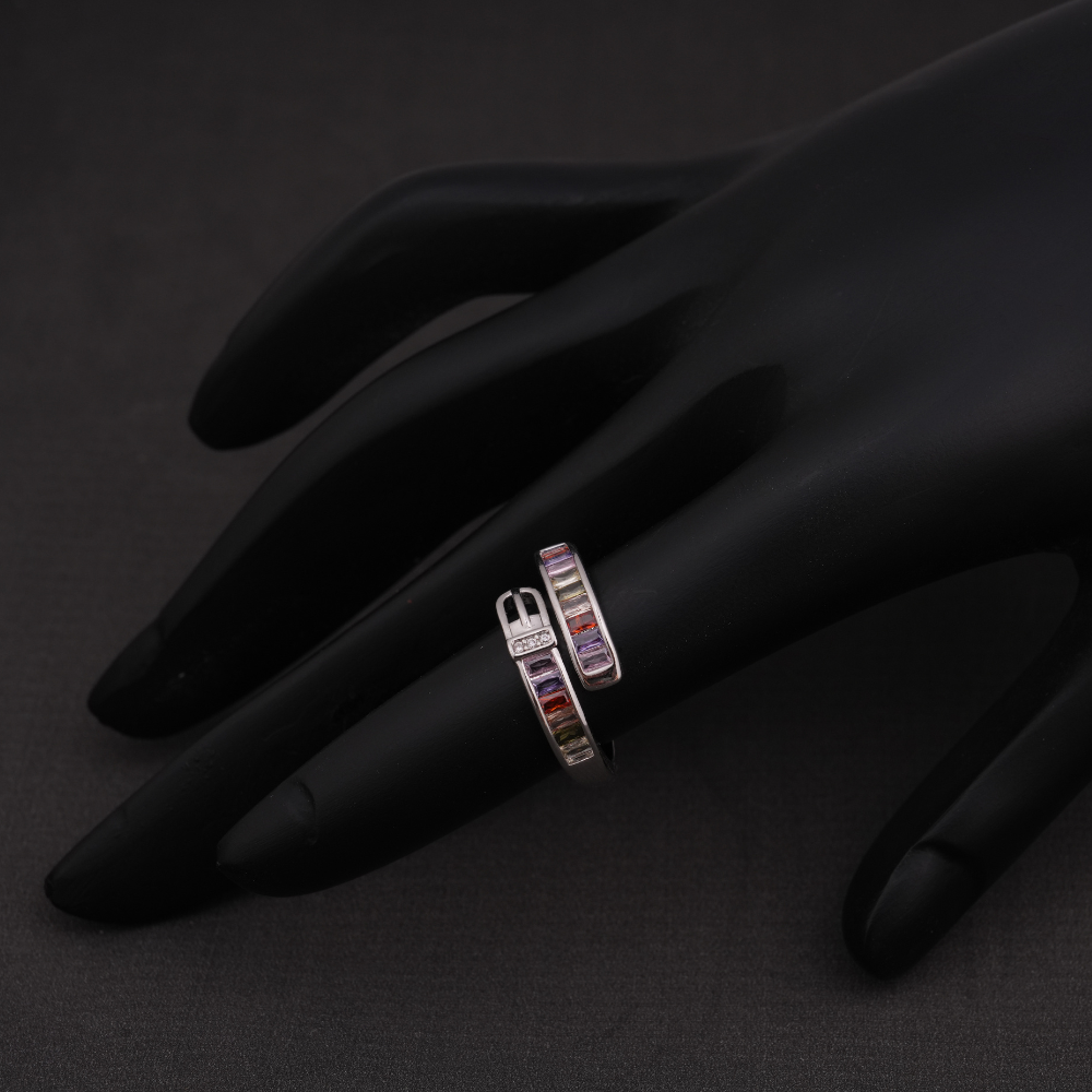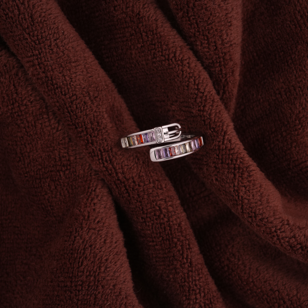 Add a playful pop of color to your jewelry collection with the Silver-Tone Rainbow Baguette Adjustable Ring. Combining contemporary geometry with vibrant hues, this open-cuff ring makes a bold fashion statement while remaining versatile for everyday wear.