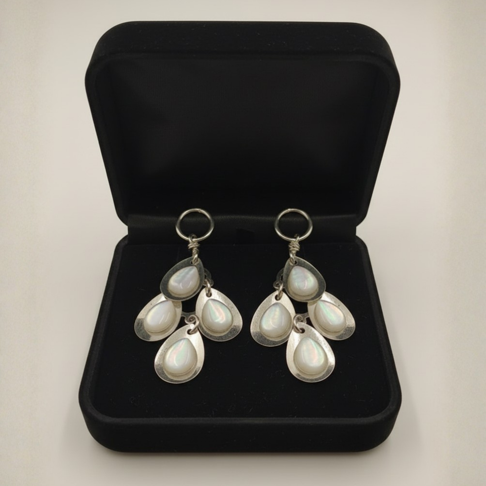These statement drop earrings feature a cascading arrangement of teardrop-shaped elements, each framed in a polished silver-tone finish. The smooth, translucent crystal inlays create a luminous glow, while the tiered drop design adds depth and gentle movement. A subtle crystal accent near the top enhances the refined sparkle, making the earrings eye-catching yet balanced.