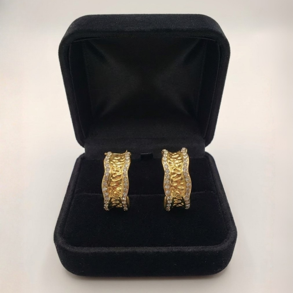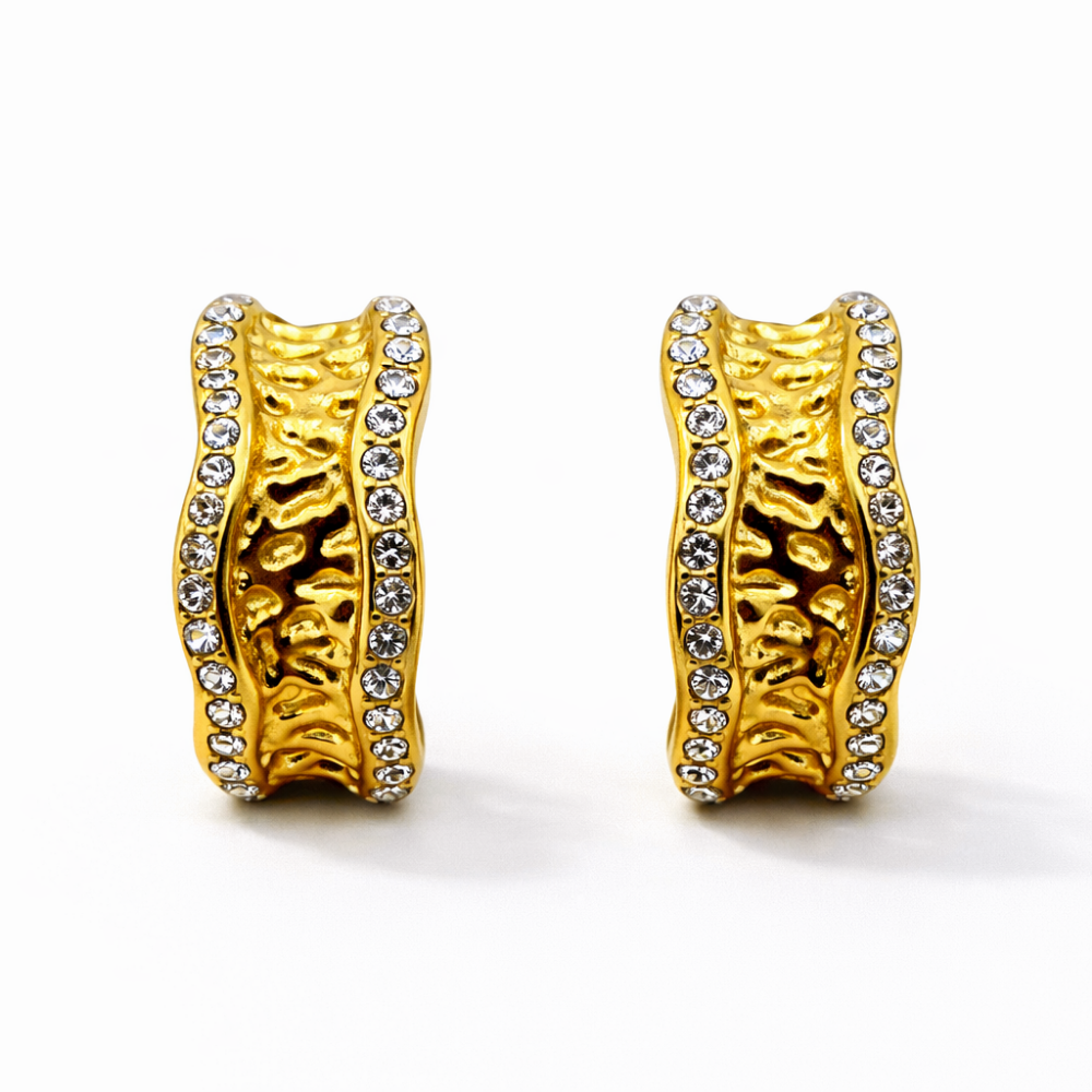 These striking stud earrings feature a sculpted, organically textured gold-tone surface that gives a handcrafted, molten-metal effect. The edges are beautifully framed with a row of shimmering crystal accents, creating a perfect contrast between raw texture and polished sparkle. Compact yet impactful, the design sits comfortably on the ear while making a bold style statement.