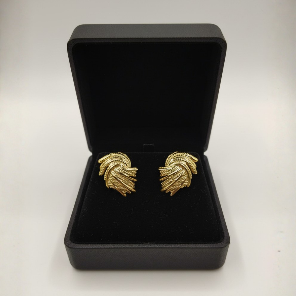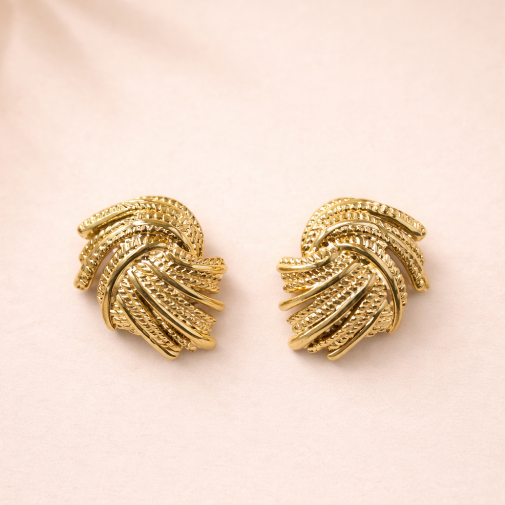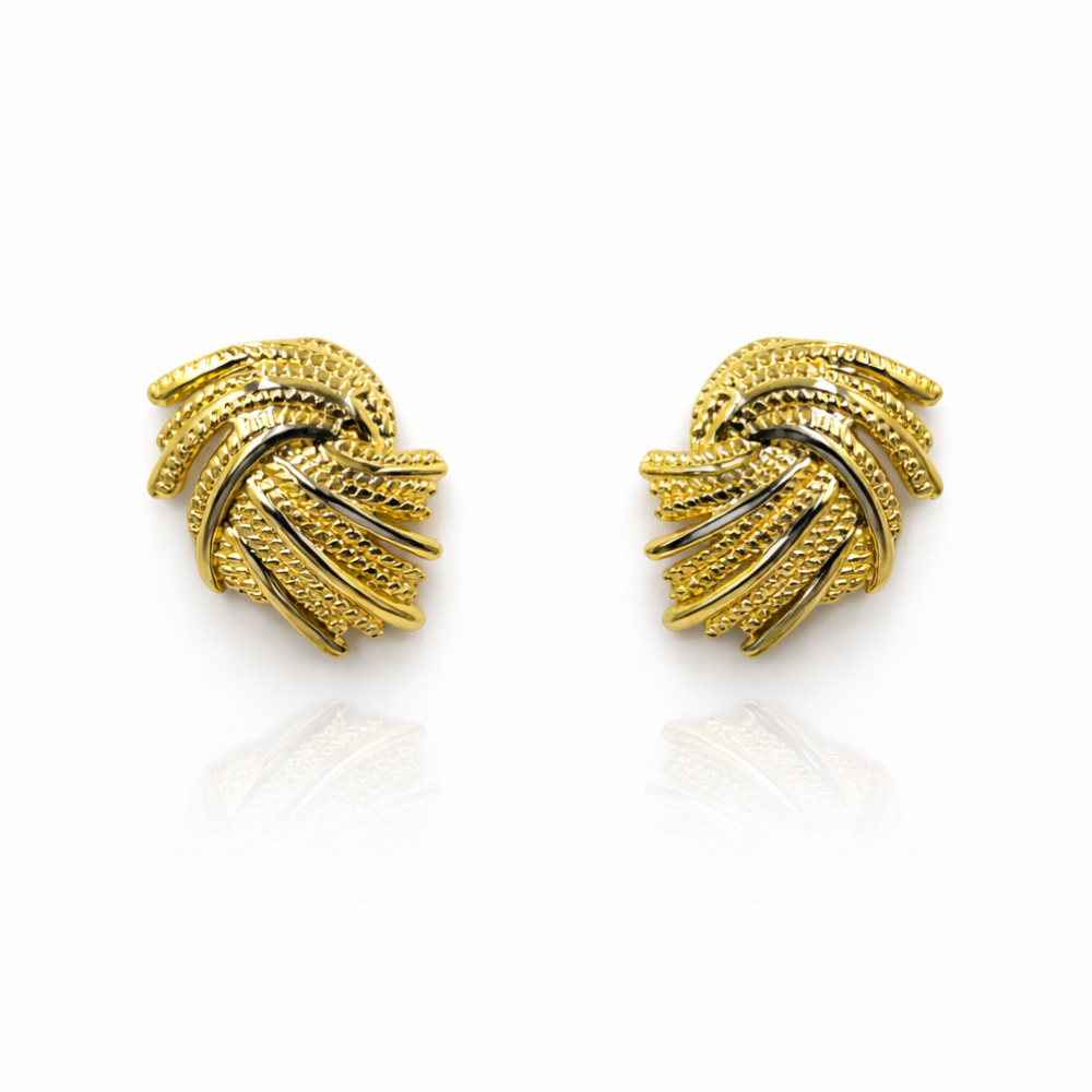 These elegant stud earrings feature a sculpted twist knot design, created with multiple intertwined strands that curve gracefully into a compact, dimensional silhouette. Each strand showcases a textured, chain-like finish, adding visual richness and artisanal charm. The polished gold-tone surface enhances the layered detailing, giving the earrings a luxurious yet wearable appeal that transitions effortlessly from day to night.