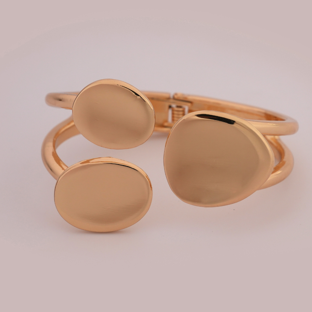 The Triple Disc Gold-Tone Statement Bracelet redefines modern sophistication with its clean geometry and fluid form. Featuring three polished discs that catch and reflect the light beautifully, this bracelet is a celebration of contemporary style and effortless grace.