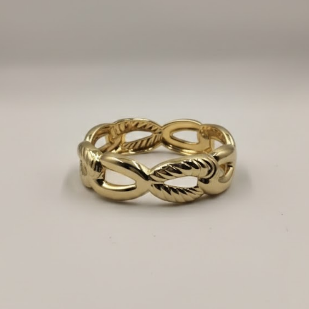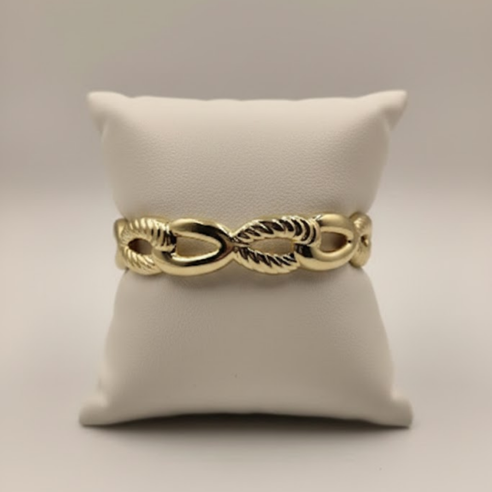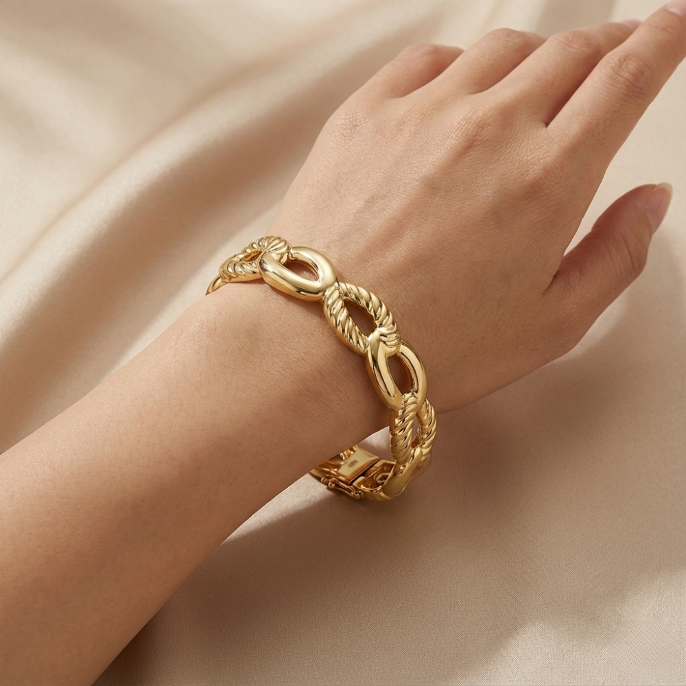 This striking bracelet features interlinked oval segments, each crafted with a subtle twisted texture that adds depth and dimension to the design. The smooth alternating links create a fluid, continuous flow around the wrist, while the rich gold-tone polish enhances its luxe appeal. Finished with a secure clasp closure, the bracelet offers a comfortable fit and a refined, high-fashion silhouette.