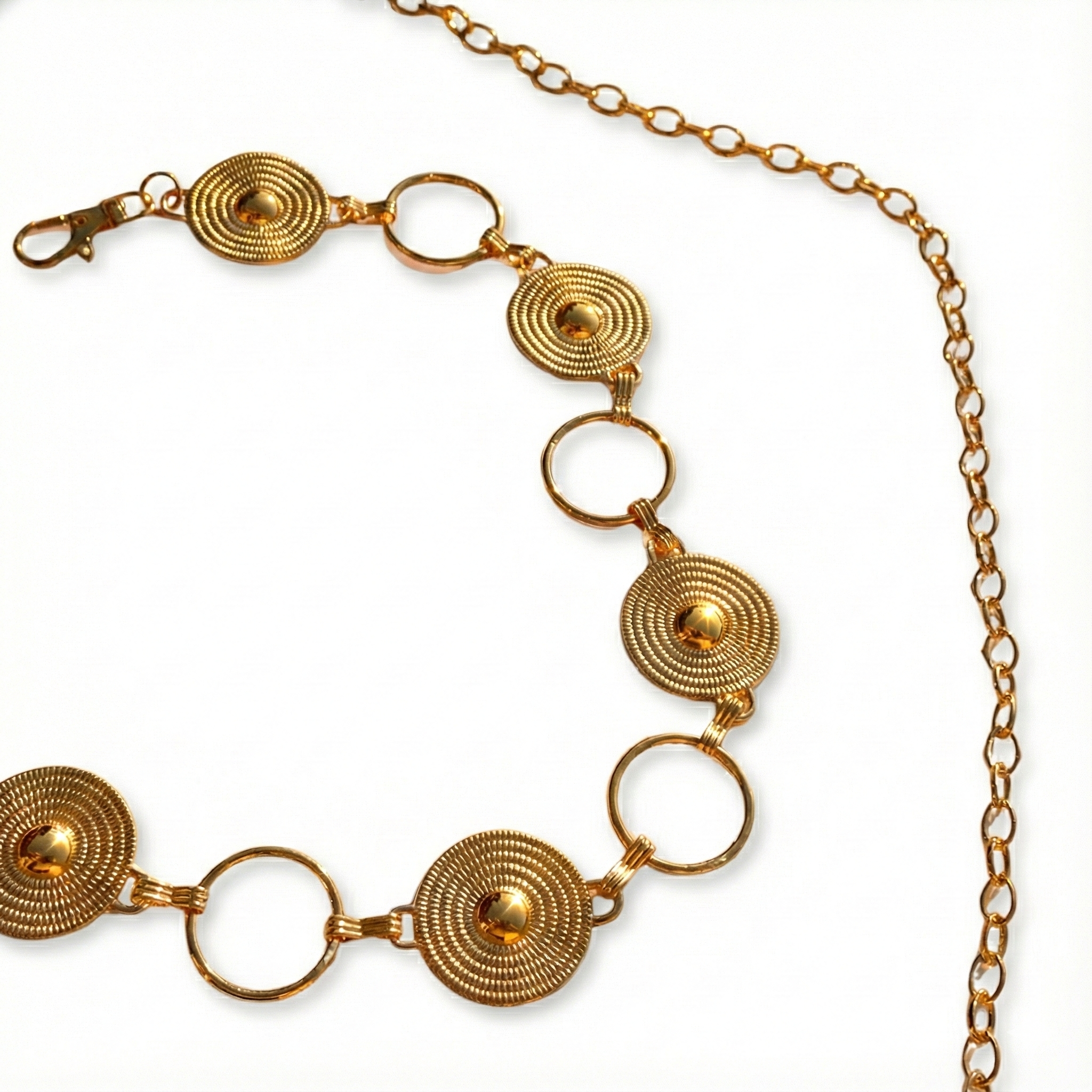Elevate your everyday look with this stunning Gold-Toned Geometric Disc Chain Belt. Designed with intricate concentric circle patterns, this metal waist chain adds a touch of bohemian luxury to any outfit. Whether you are cinching a flowing black dress, styling a tunic, or accessorizing a traditional saree, the adjustable lobster clasp ensures a perfect fit for every waist size. Lightweight yet durable, it is the ultimate statement piece for your wardrobe.